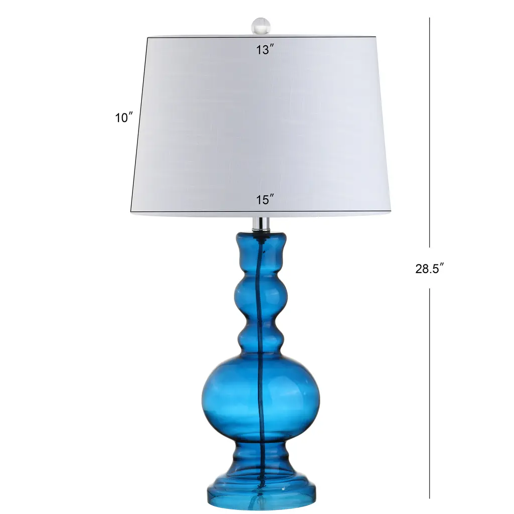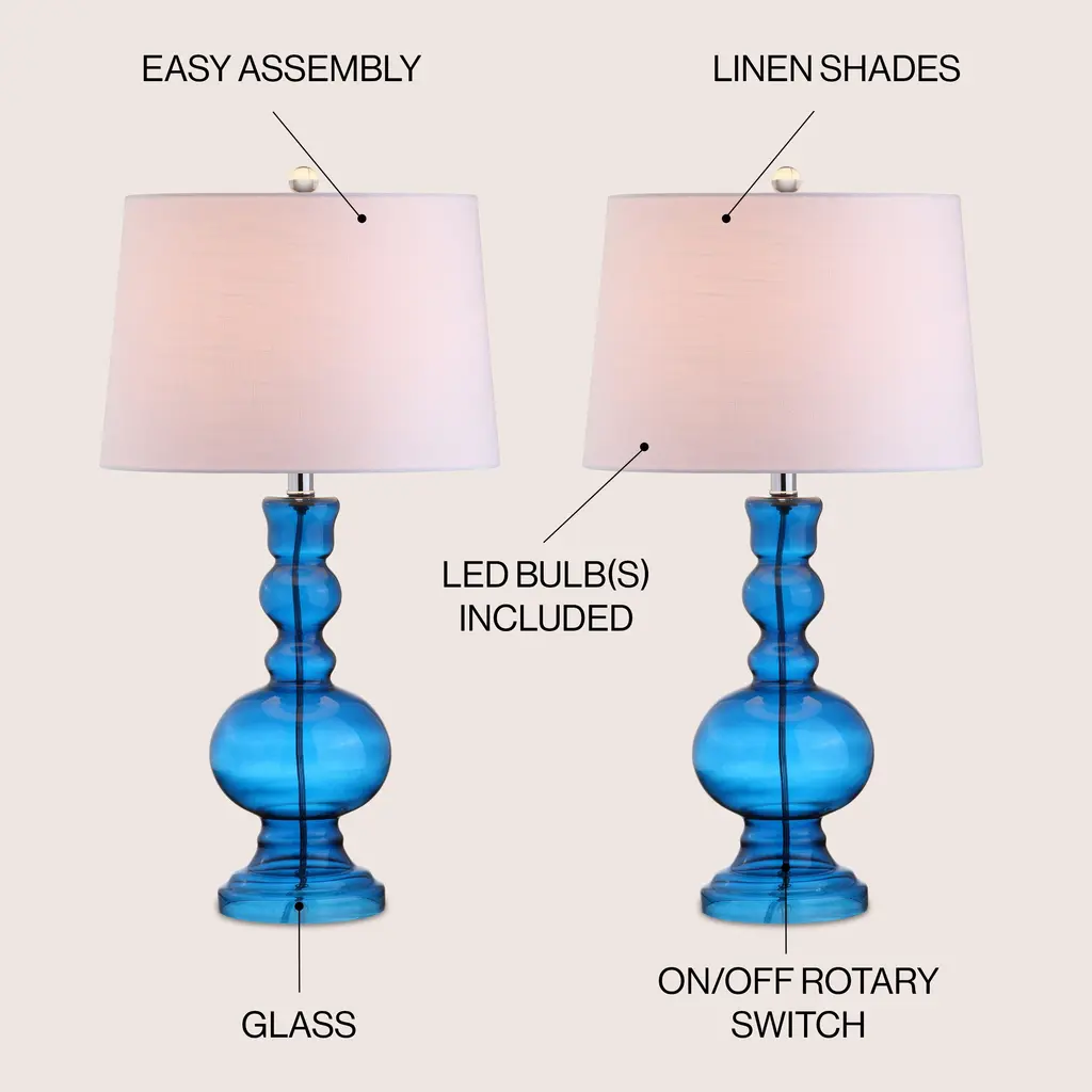 Bookend a shelf or console with an eye-catching pair of these beautiful blown-glass table lamps. The vibrantly hued glass bodies are gently curved, and the crisp white shades finish these lamps in classic style. A statement-making aqua hue makes this set of two the perfect pair for infusing color into your home decor. Features:Dimensions:About us:You see a lamp.We see a decorative work of art.A perfectly curved shade casts a dramatic shadow on a floor. A silk cord you never want to hide. LED lightbulbs: as easy on the environment as they are on the eyes. The JONATHAN Y Lighting collection considers every detail from impeccably sourced materials to designer styling. And our prices are so attractive, we've transformed a functional necessity into a fashion accessory.JONATHAN Y Lighting - a fashion revolution in home decor.