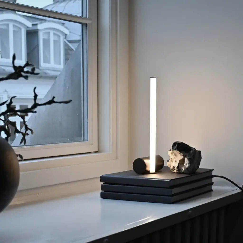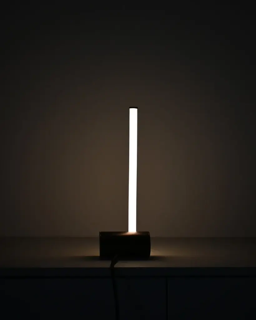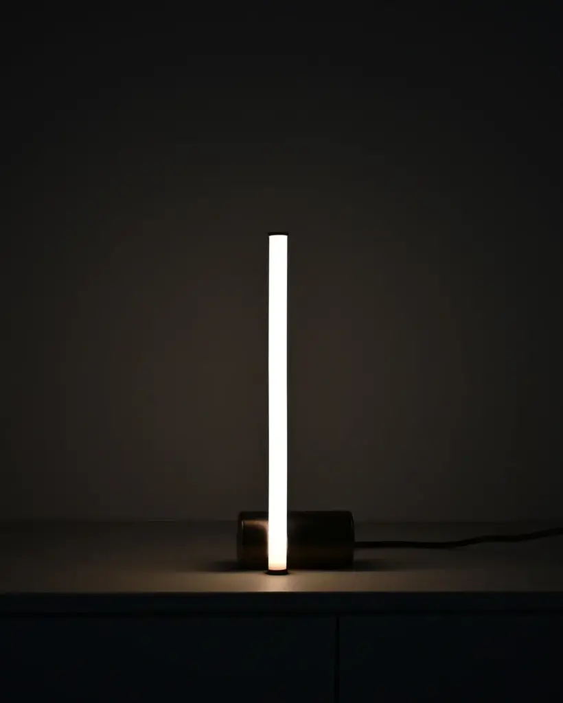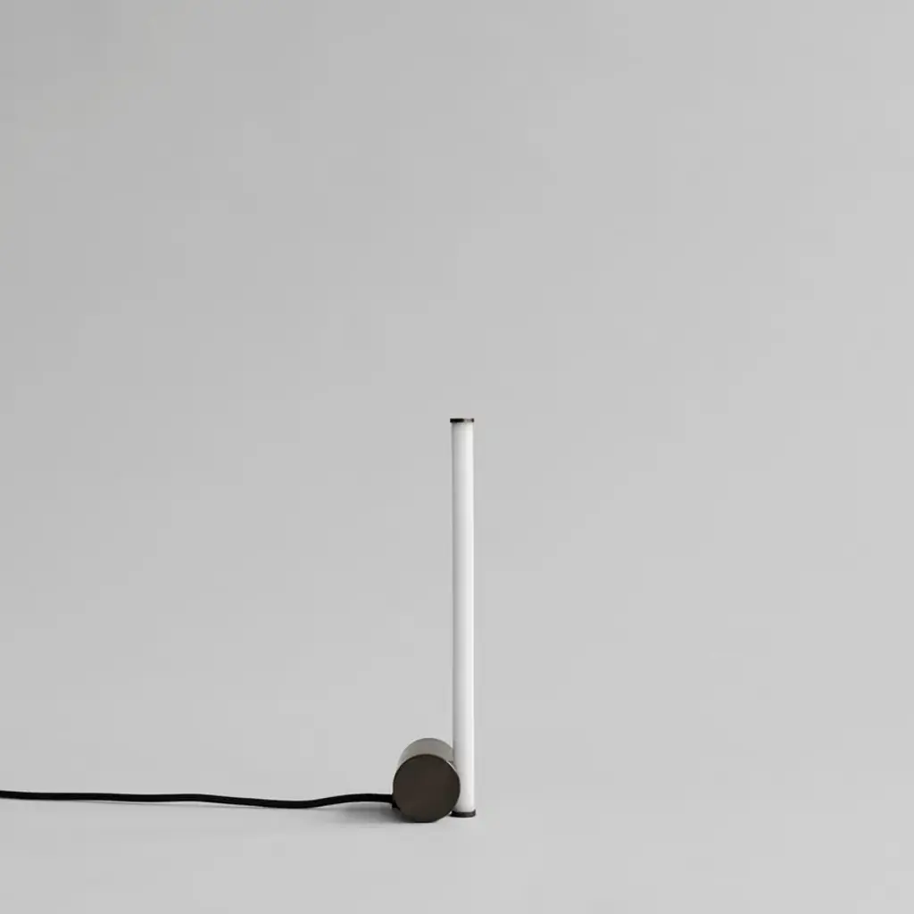 Stick Table Lamp is a table lamp made of plated metal and a white acrylic tube, housing an LED light source.