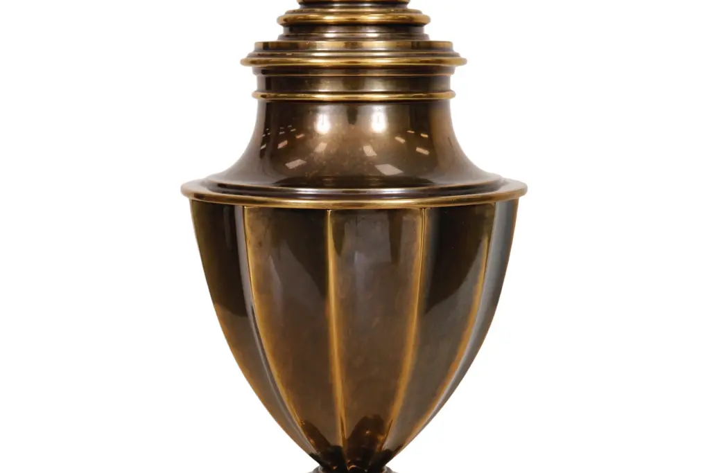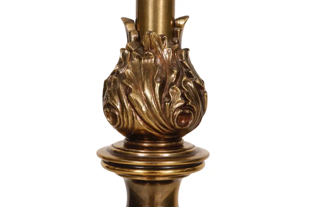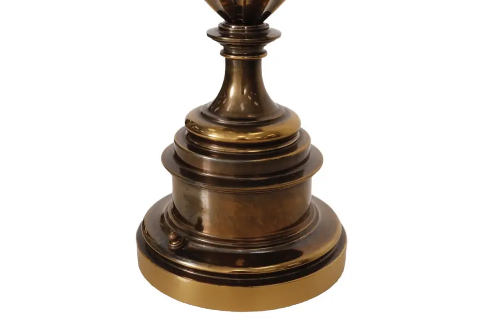A Stiffel model #5561 table lamp in brass. Cast in a trophy style with curled acanthus leaves above a fluted urn. The small on-off rotary knob is on the base which is cast to give the look of being heavily turned. The Stiffel label can be seen on the socket. Measures 26.25�������������������� to the top of the socket and 36.25�������� to the top of the finial.