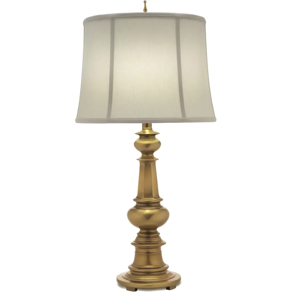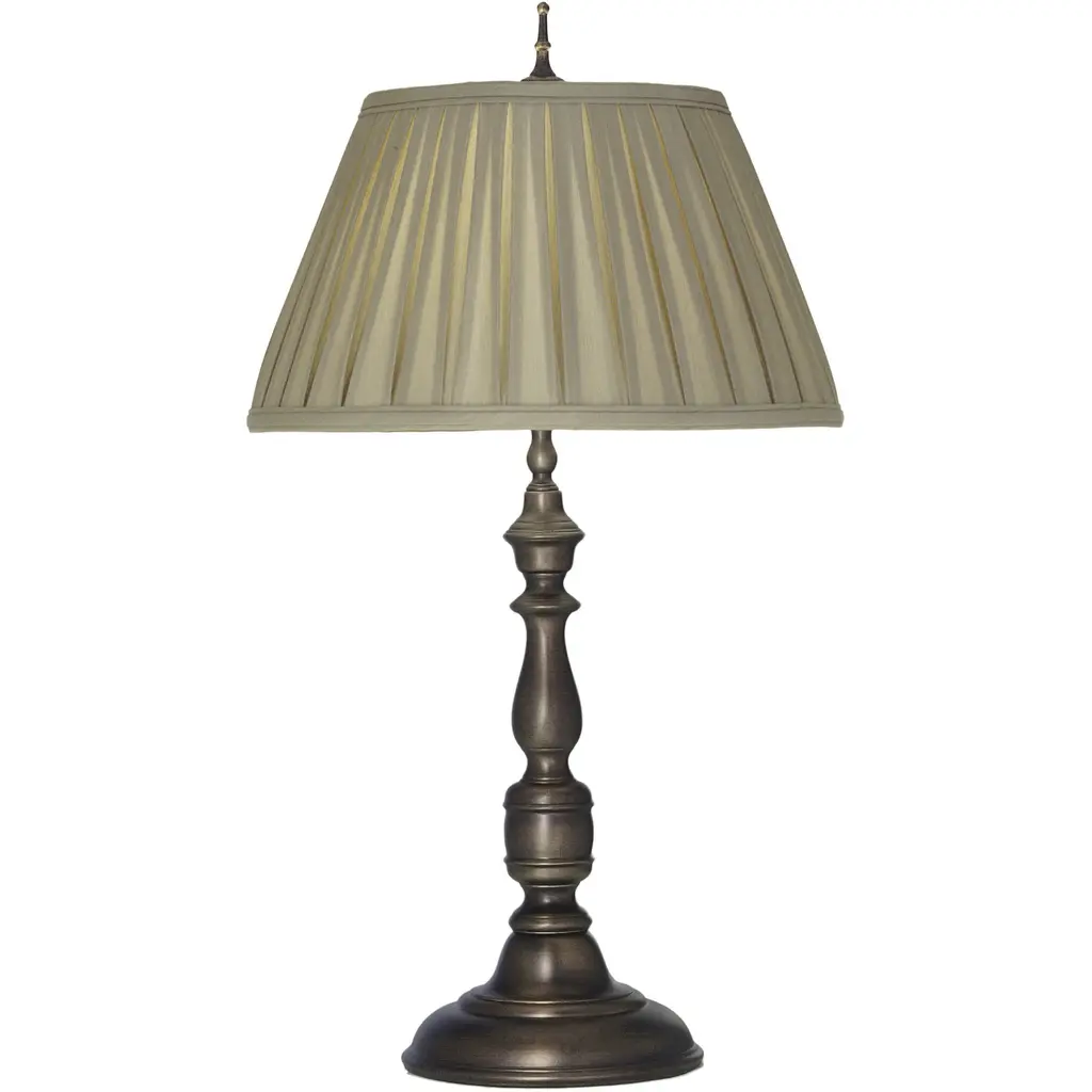 Elegant metal base in burnished brass finishOyster silksheen box pleat shadeConvenient 3-way socket switchRequires one 150-watt max bulb (not included)Proudly made in the USA