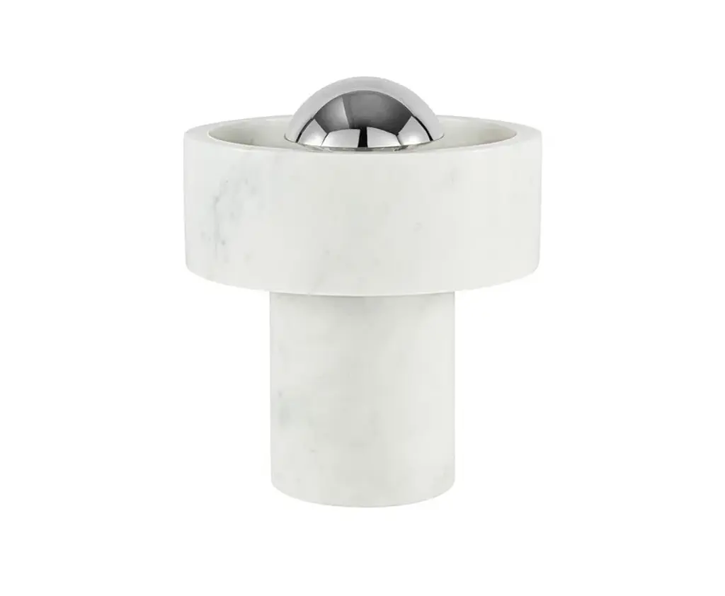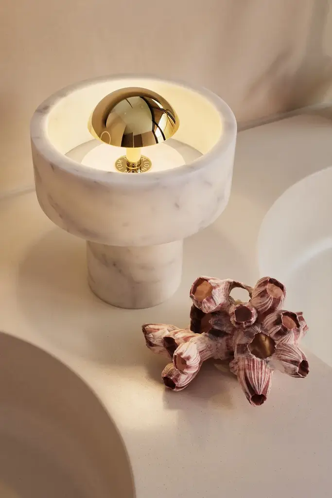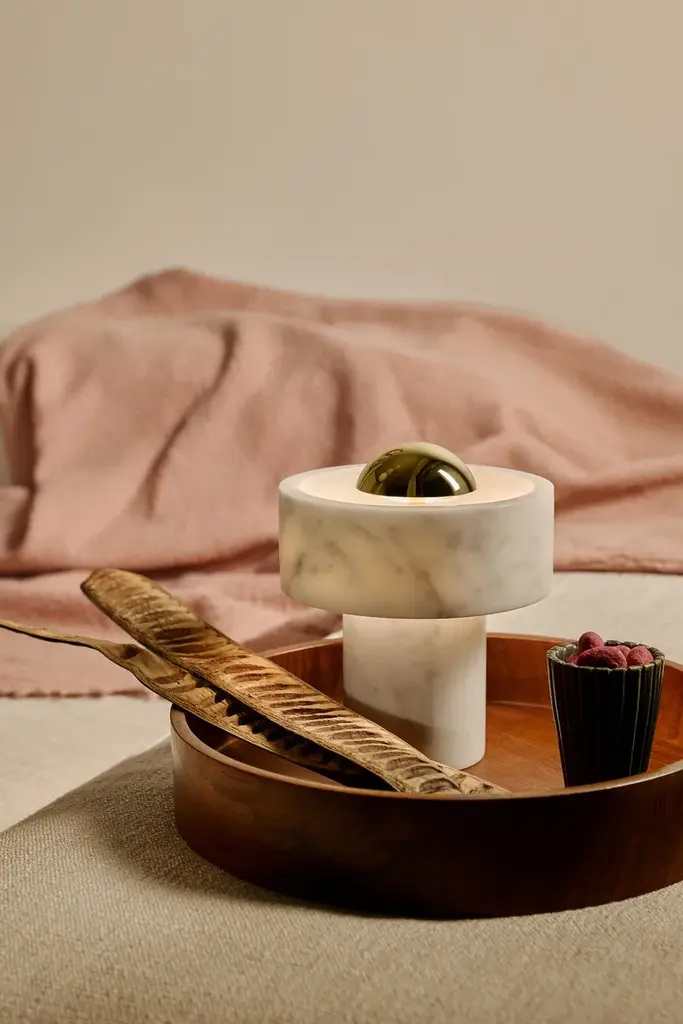 Stone is inspired by the materiality of the same marble used to build the Taj Mahal. The hard, semi-precious stone bears a unique fingerprint – tactile, heavy and long-lasting. Stone is characterised by a solid outer marble ring that appears to be floating around the light source giving out a soft halo effect. Stone Portable LED has an integrated touch dimmer and offers up to 9 hours of battery life.A portable light in solid marble stone and brass with integrated touch dimmer. Finishing Process Polished, PlatedPower Method RechargeableBattery Operating Time Approx 7-9 hoursBattery Charging Time Approx 5 hoursCable Spec AWM 2464 22AWG VW-1 1A 80 °C 300VCable Type/Length USB-A to Magnetic, 200 cmLight Source 3W LEDMax Wattage 3WLumens 160CRI >90Colour Temperature 3000KDimmability Touch DimmableVoltage 5VEnvironment Indoor, IP20Spares LEDPB02, POBAT01, POMC01Certification/Electrical ClassT20, Certified for NZ/AUSA series of lighting and accessories inspired by the materiality of the same marble used to build the Taj Mahal. The hard, semi-precious surface which bears a unique fingerprint has transfixed architects, sculptors and designers for millennia, and for us too this is the dream material - tough yet tactile, heavy and long-lasting