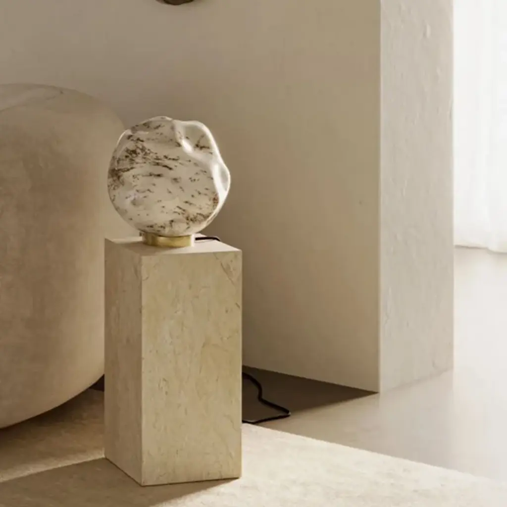 The Stone Table Lamp from Il Fanale adds a glorious vintage presence to desktops and side tables alike. Ascending from a metal collar-style base that elevates strong lamping, it places that lamping beneath a contoured shade of stone glass, each one handblown by artisans and each one taking on its own subtly unique characteristics. The stone glass exemplifies water-washed rock dappled by sunlight, the brass powder in the glass transporting the eye across its curves and transmitting an even warmth around the fixture.
