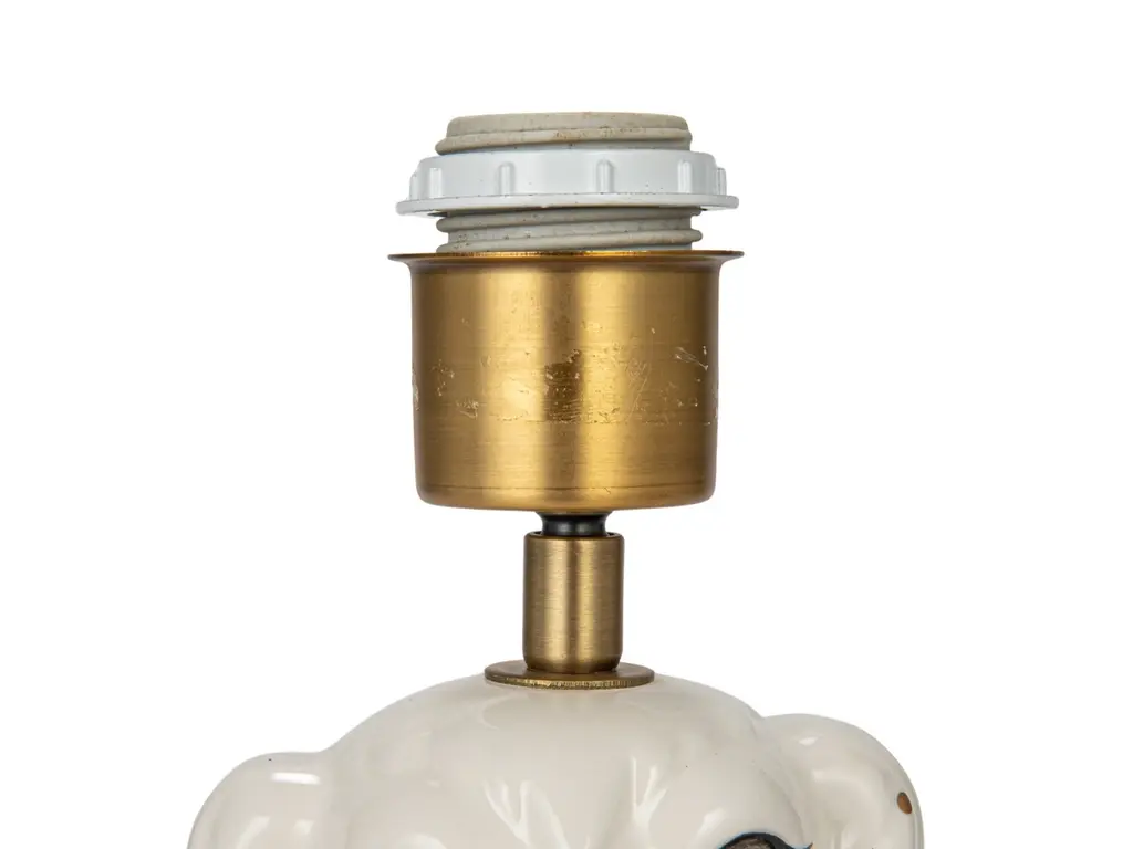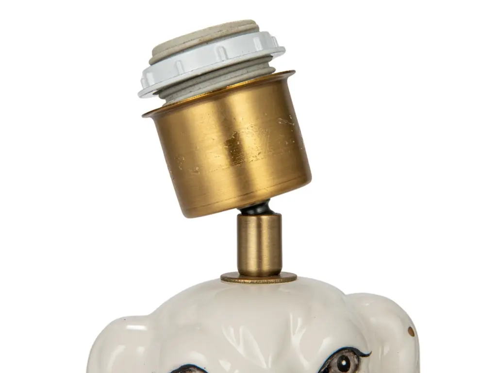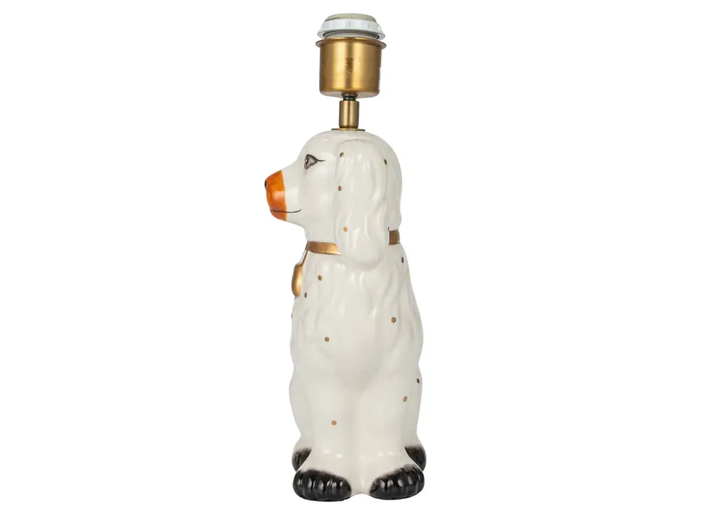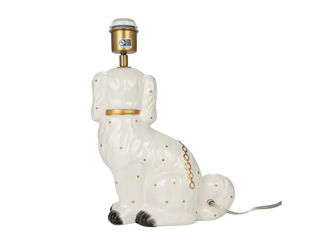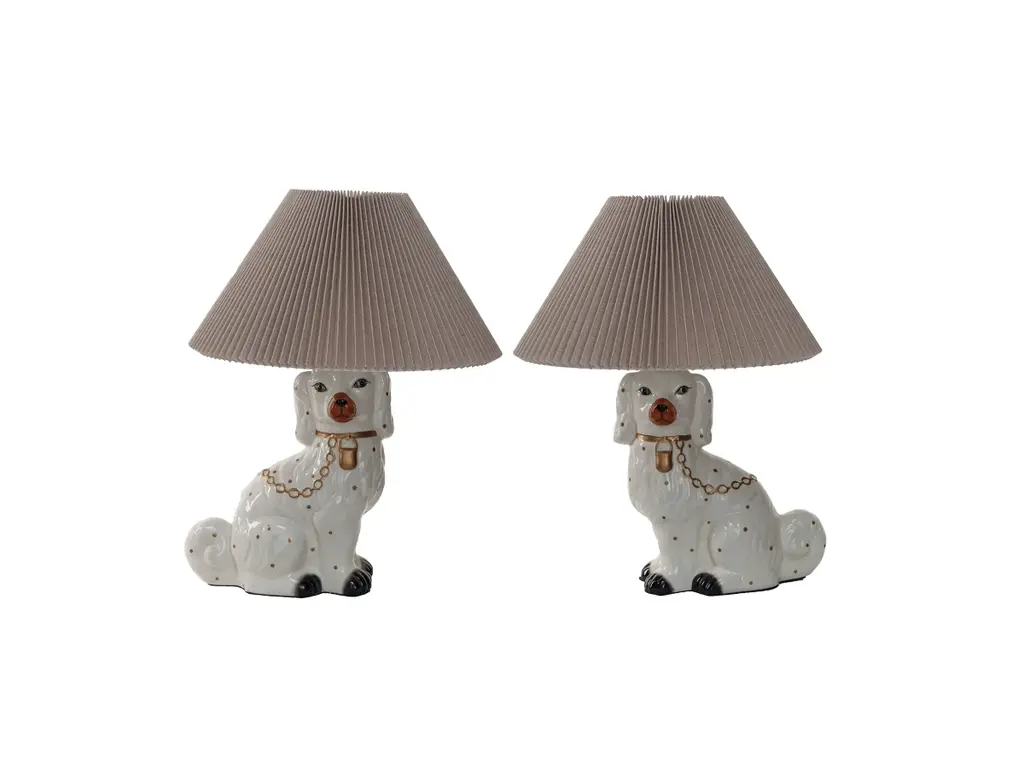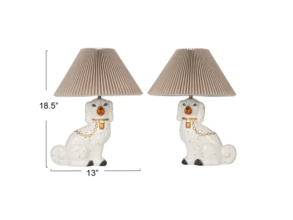 This hand-painted ceramic vintage reproduction Staffordshire table lamp features a dog-shaped base, inspired by 18th and 19th-century Staffordshire pottery. The base is multi-colored, adding variety and texture to the decor. The pleated fabric shade complements the base, diffusing light from a 60-watt bulb for a soft, warm glow. The white shade adds brightness and contrast to the space. The lamp has an inline switch for easy control. Made of ceramic and cotton, it measures 13 inches in diameter and 18 inches in height, making it suitable for any table, desk, or nightstand. Available in two styles, the dog style is customizable. This lamp adds history and personality to any room, making it a great choice for adding charm and elegance to the space.