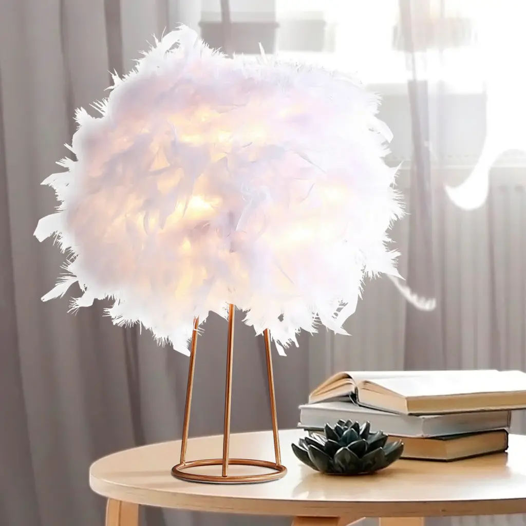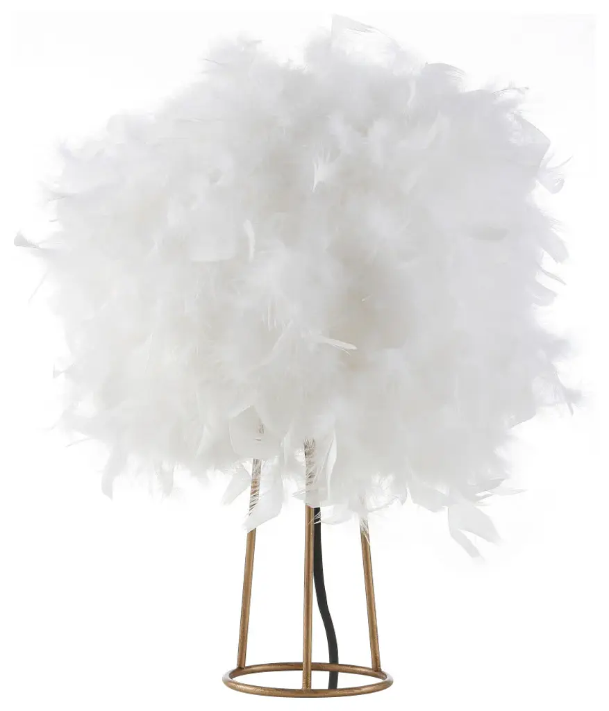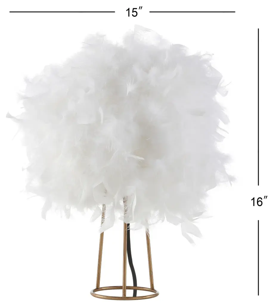 Light as air, this chic table lamp is charming and contemporary adorned in white feathers. With a single bulb and brass base, the scene-stealing feather dome softens the light while retaining a contemporary aesthetic that blends well with any style of decor. And at only 16" high, its small scale is well-suited for any surface. Features:• This shade is a showstopper and should be dusted regularly to maintain its ethereal aesthetic • Eco-friendly 4W LED bulb included• Takes one bulb and compatible with any 9W LED or 40W TYPE "B" or 13W CFL• UL Listed • 0• 0• Color: White/Gold• Body Material: Metal• Base Material: Metal• Includes: One (1) lamp(s)• Minor Assembly RequiredDimensions:• Lamp: 16 inches high x 15 inches wide x 15 inches deep• Shade: - inches high x - inches wide x - inches deepAbout us:You see a lamp.We see a decorative work of art.A perfectly curved shade casts a dramatic shadow on a floor. A silk cord you never want to hide. LED lightbulbs: as easy on the environment as they are on the eyes. The JONATHAN Y Lighting collection considers every detail from impeccably sourced materials to designer styling. And our prices are so attractive, we''ve transformed a functional necessity into a fashion accessory.JONATHAN Y Lighting - a fashion revolution in home decor.