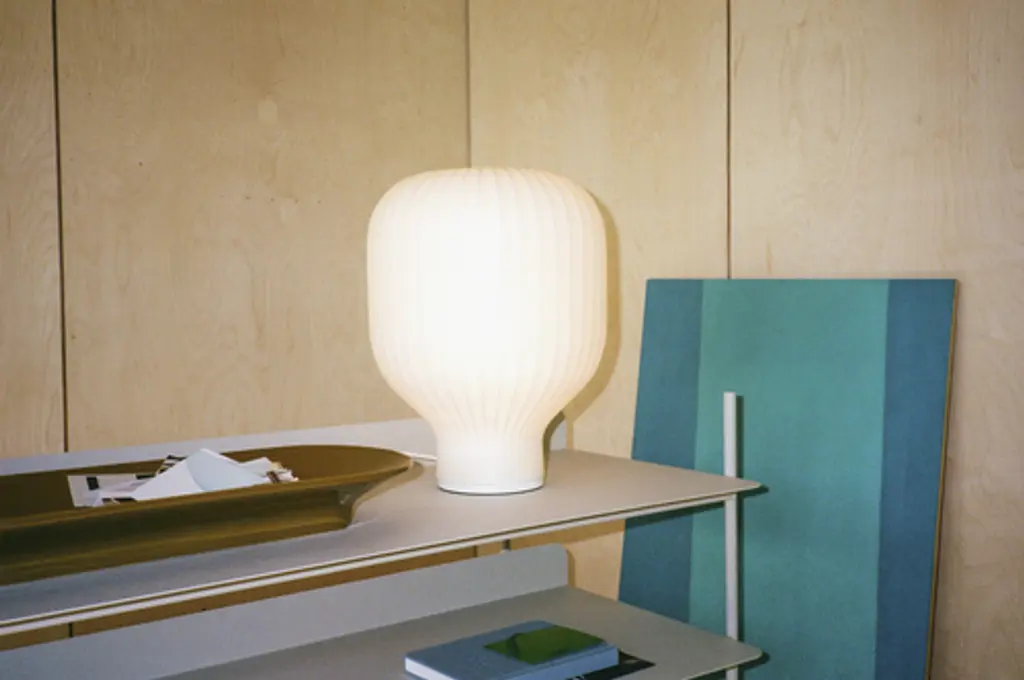 The Strand Table Lamp references design history while remaining distinctly modern. Its shape is soft and playful, and its sculptural design is fitted with a hidden light source that illuminates the whole of its monolithic form. The lamp is made of sprayed cocoon material that consists of tiny strands for a complex, intriguing structure that gives the Strand Table Lamp an almost cloud-like appearance. Filtering light for a warm, comfortable glow brings a sense of comfort, harmony, and a refined sensitivity to any room. Available in both small and larger sizes, the Strand offers versatility in placement—from desktops and shelves to floors for the larger model.