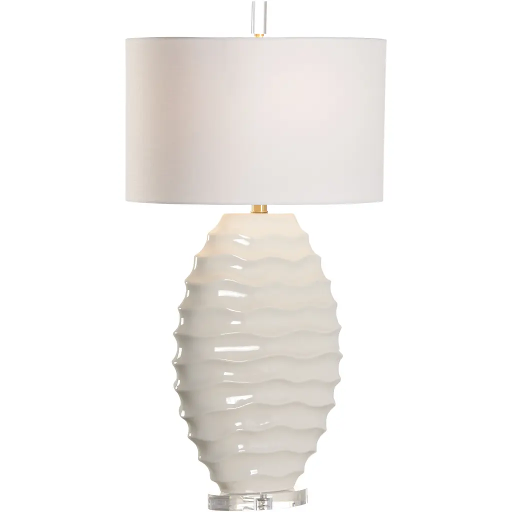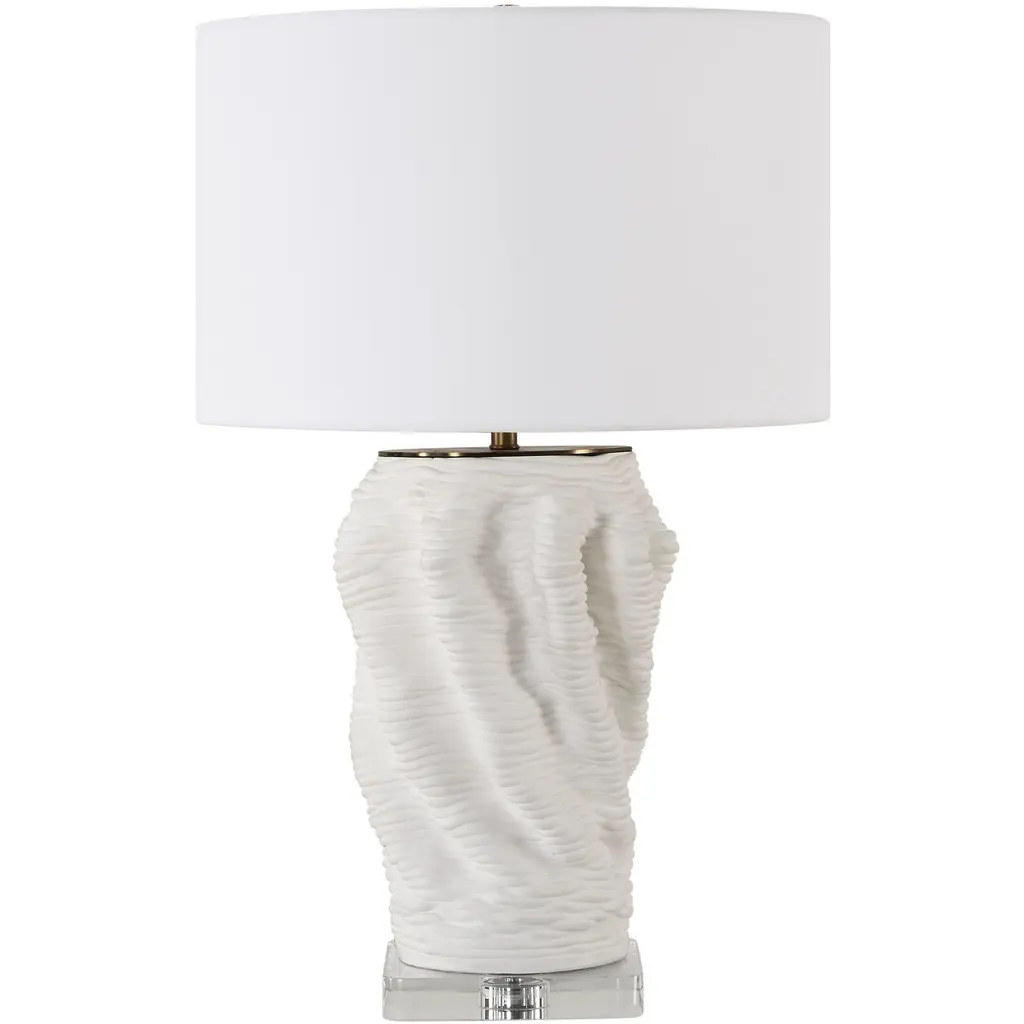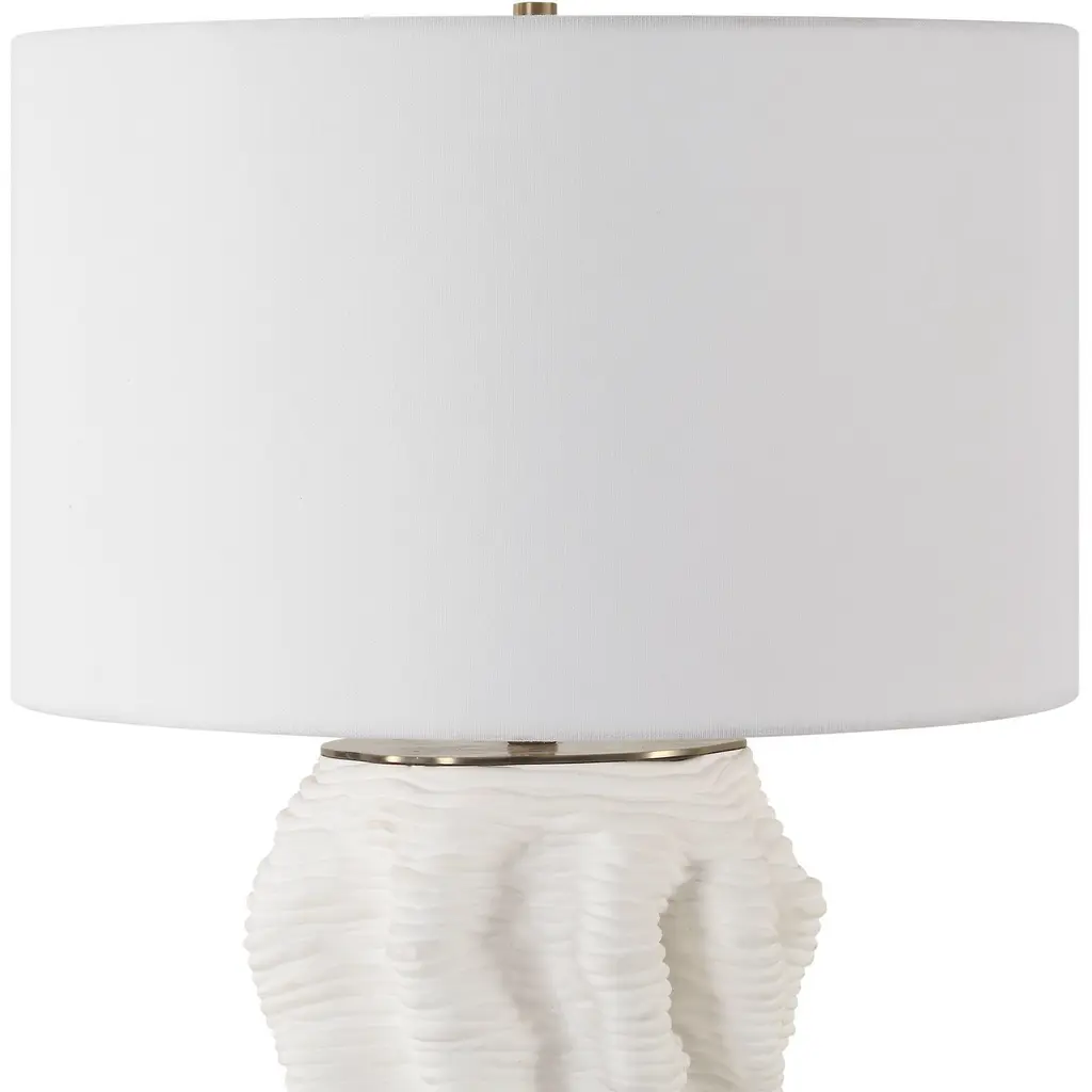 This Unique Silhouette Creates A Modern Look With Its Organic, Free Flowing Shape. Combining Sculpture And Functionality, This Ceramic Vase, Featuring Layers Of Organically Shaped Stacked Rings, Finished In A Matte White Glaze, Accented With Brass Plated Details And A Thick Crystal Foot. The Round Drum Shade Is A Crisp White Linen Fabric.