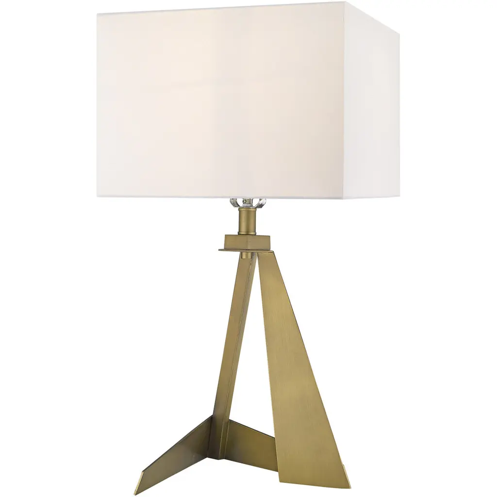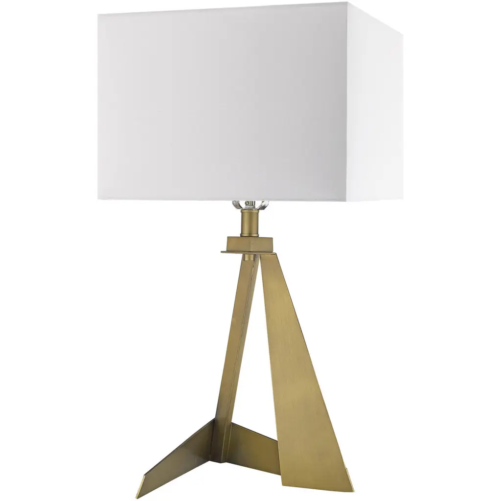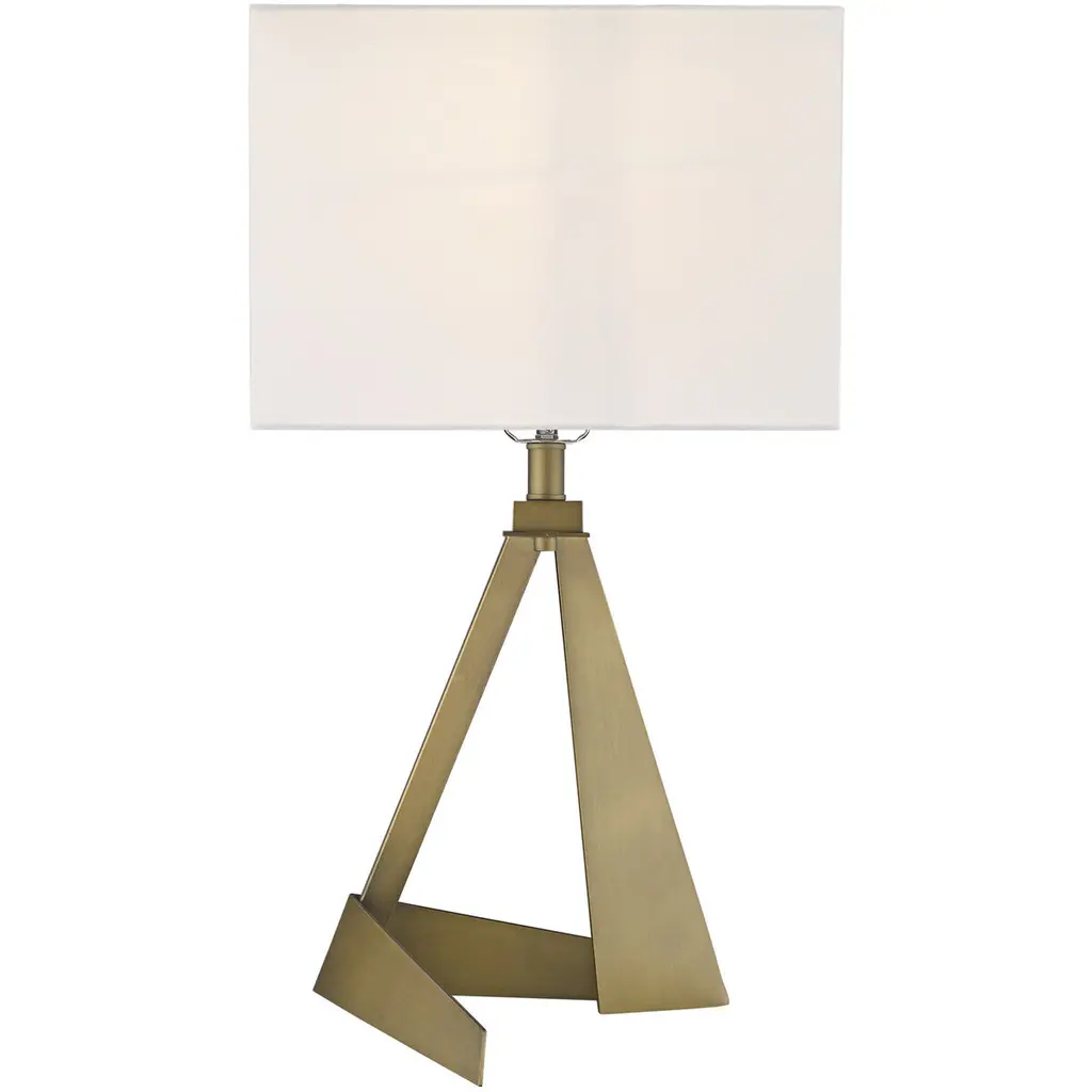 Stratos features an asymmetrical, geometrically designed body finished in aged brass. The sharp lines of the body continue on the white, square fabric shade. Its unique shape makes this lamp stand out from the rest.