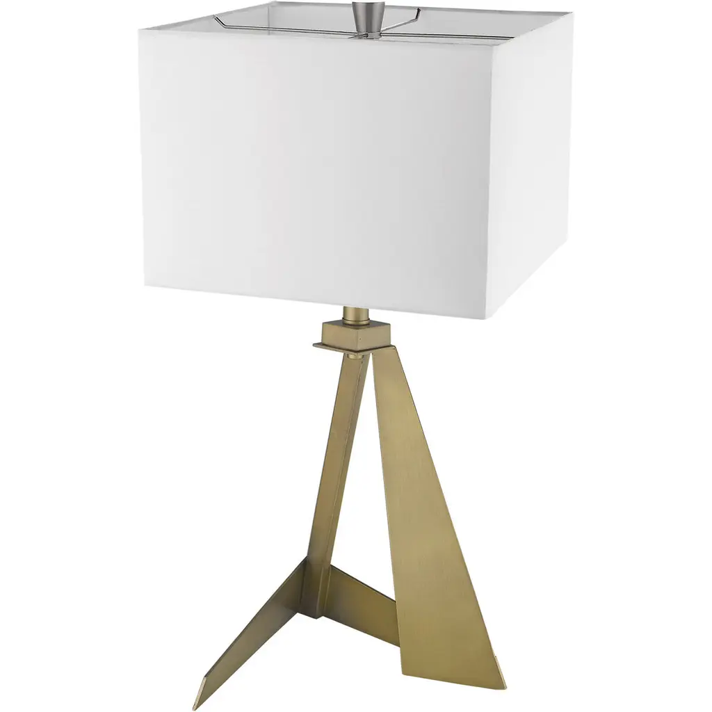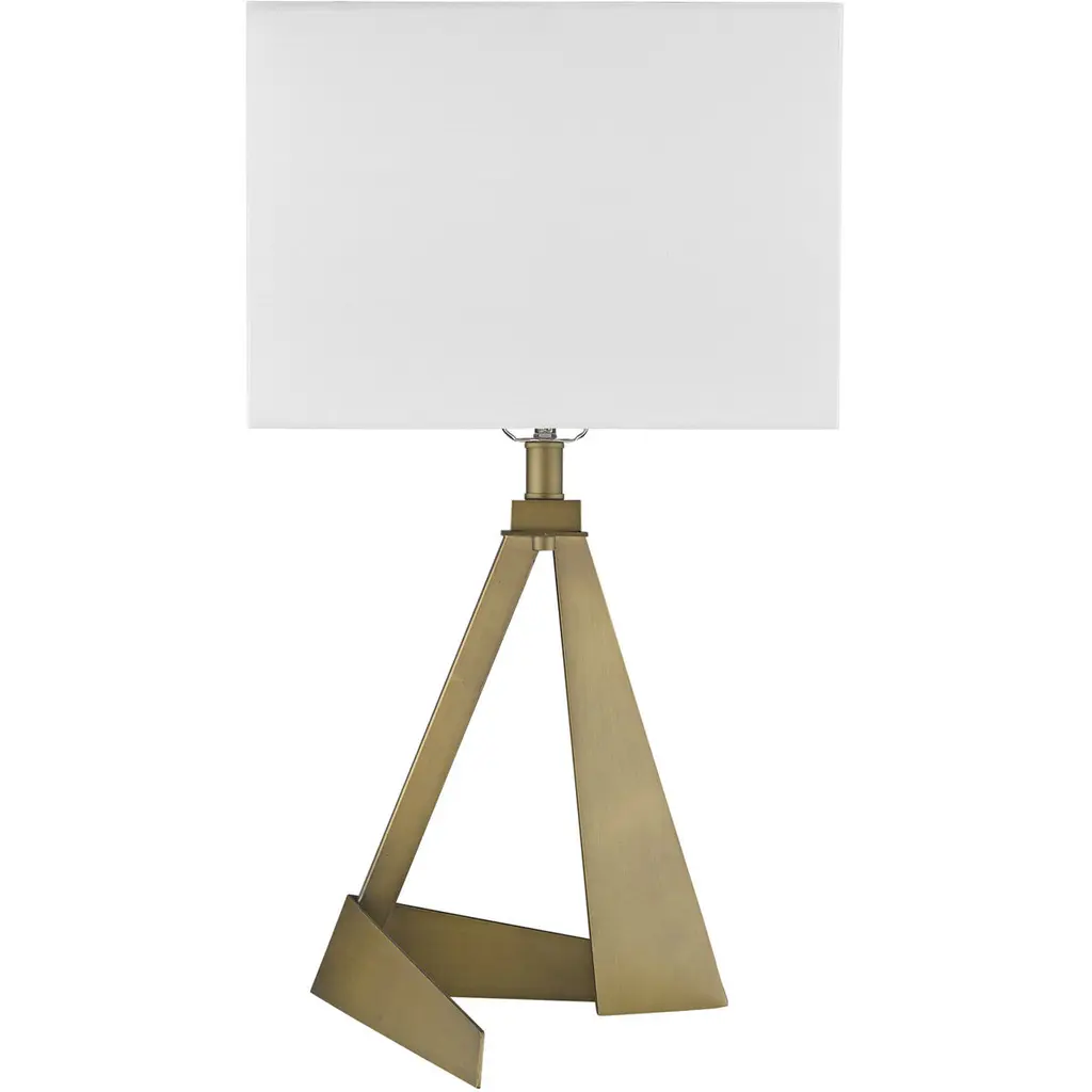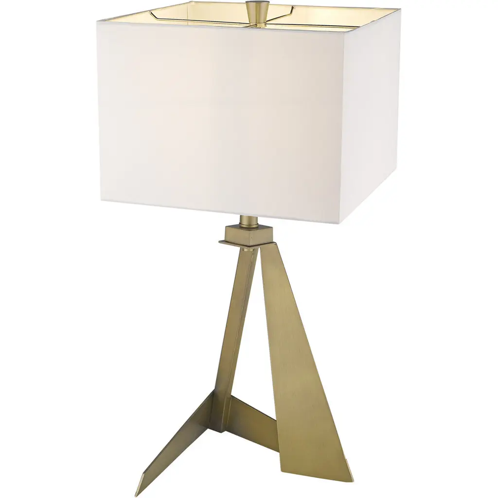 Stratos features an asymmetrical, geometrically designed body finished in aged brass. The sharp lines of the body continue on the white, square fabric shade. Its unique shape makes this lamp stand out from the rest.