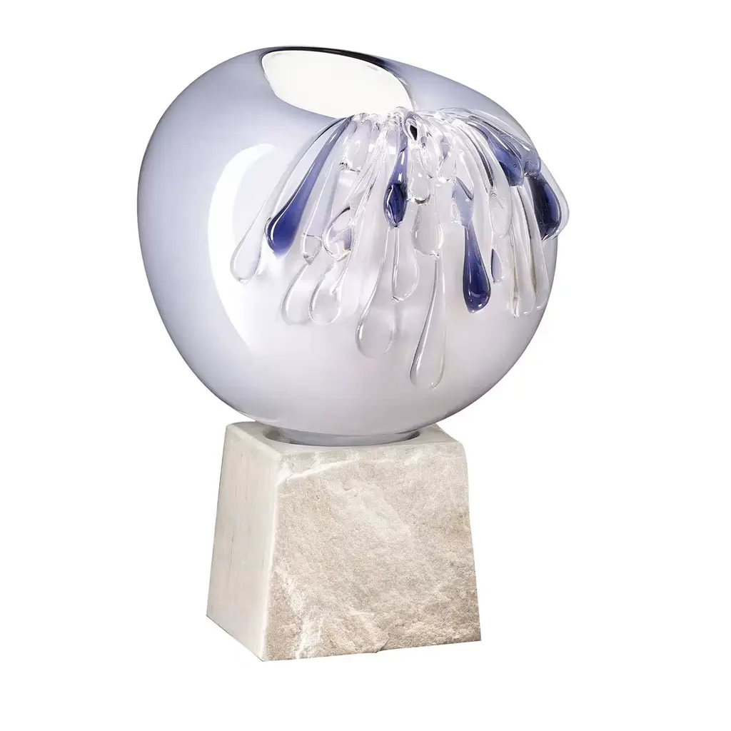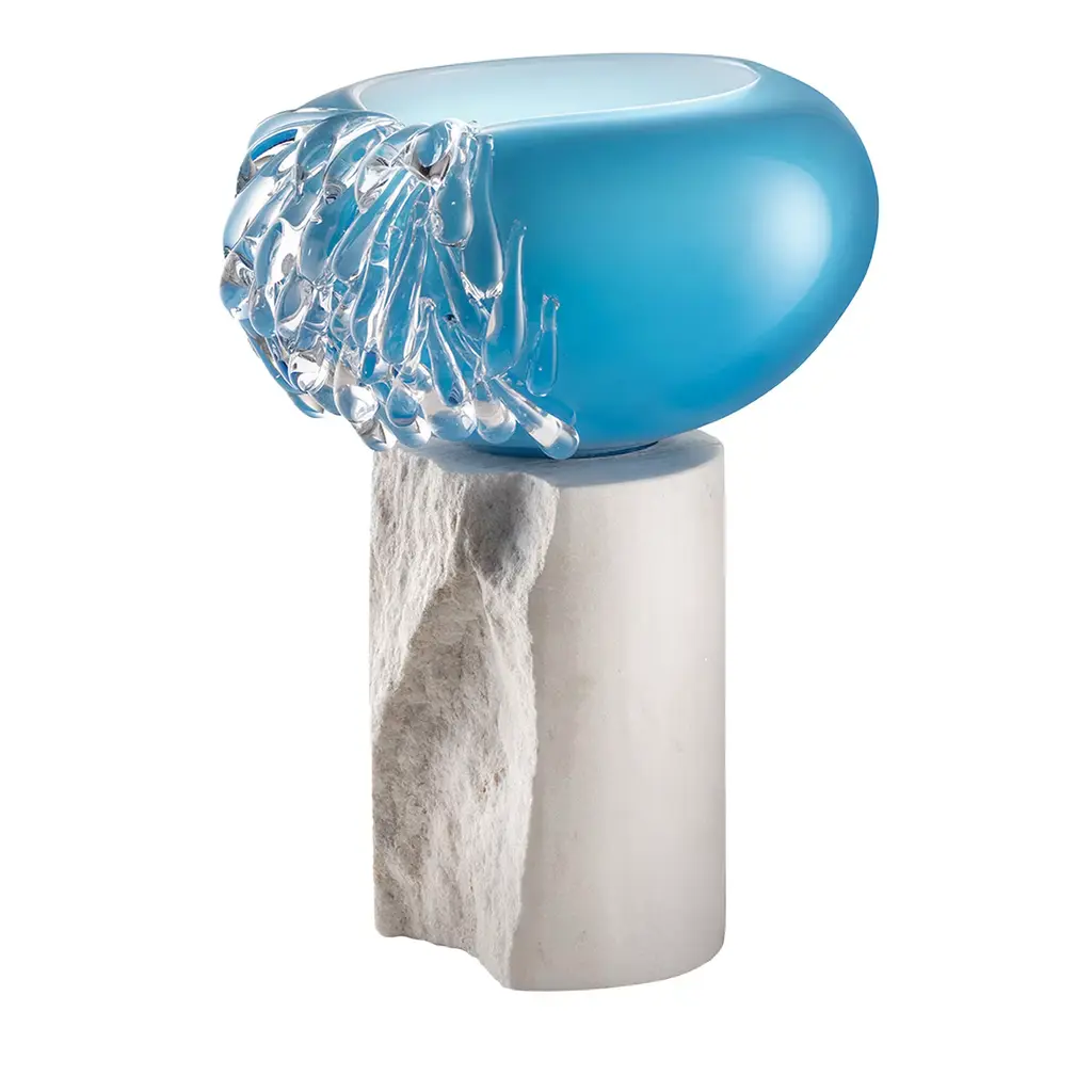 Highly collectible pieces embody Murano artisans' mouth-blowing techniques. Asymmetrical vase and stunning Murano glass create a memorable sculptural lamp, paired with Palissandro marble's silent monumentality. This table lamp combines Murano craftsmanship with a unique blown vase, featuring opaline technique in kelly green, and dozens of transparent crystal water drops joined to a white marble trunk, representing mountain peaks during the majestic Venetian event, Stravedamento.