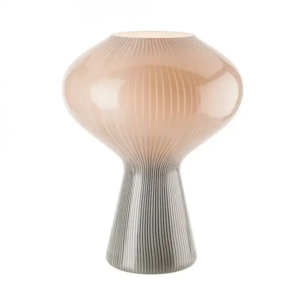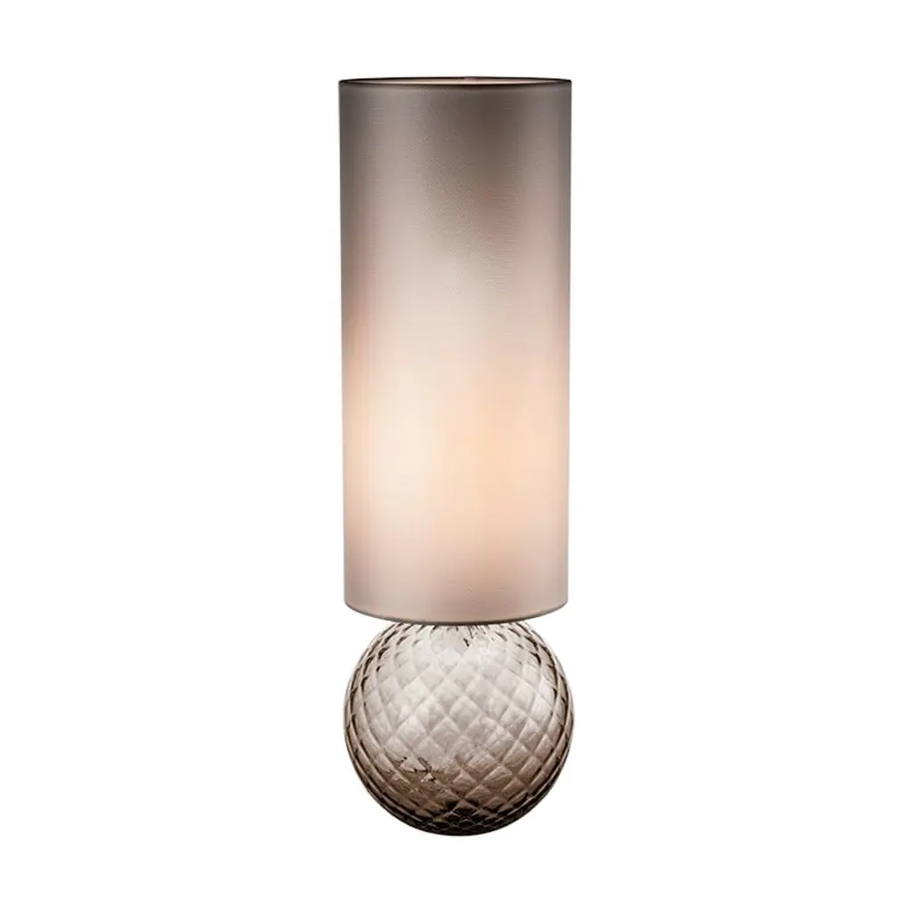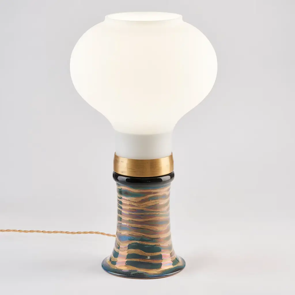 As its name anticipates, the irregular polychrome stripes on the turned faience base of this table lamp flaunt a natural sheen due to the interaction of enamels and luster. Leandro Lega's series of '70s vases inspired the technique of second reduction firing, which lends the base a subtle glowing quality even when the light is off. A bud-shaped opaline glass diffuser completes the piece.