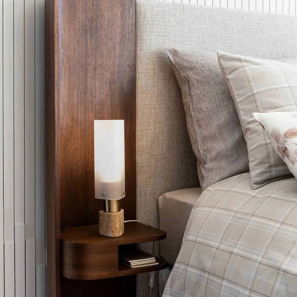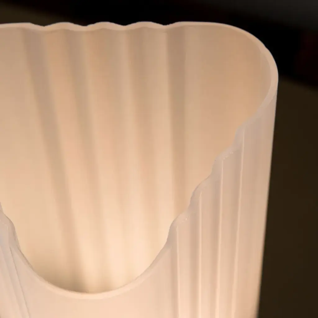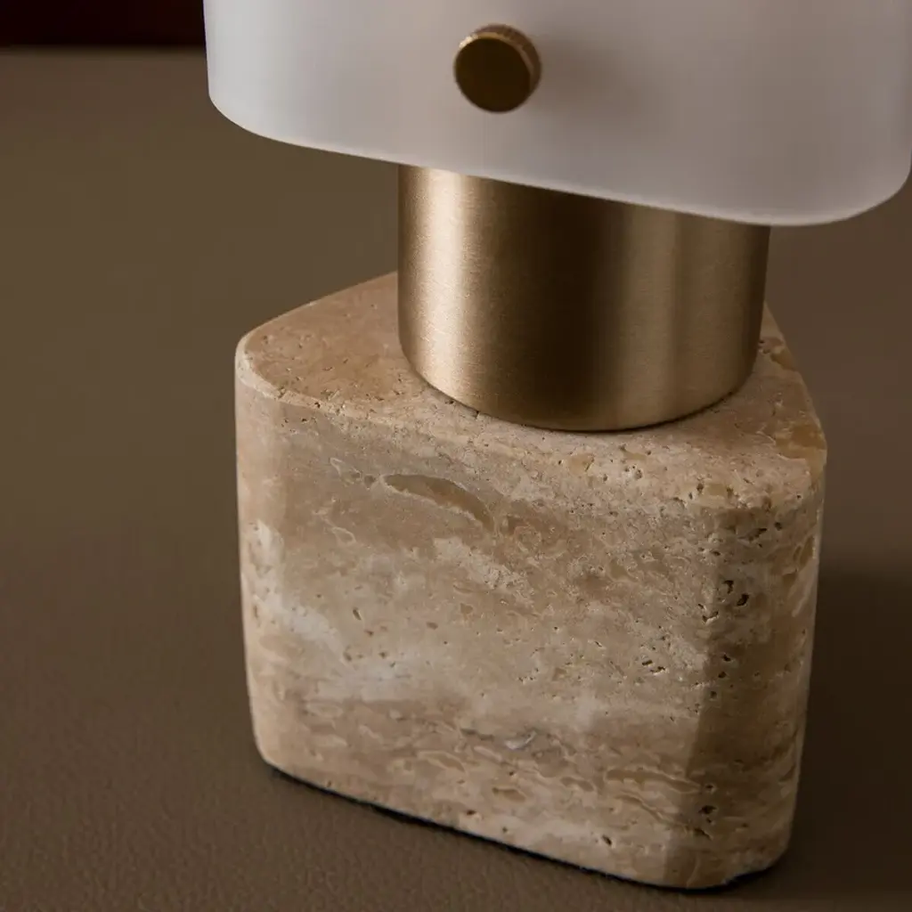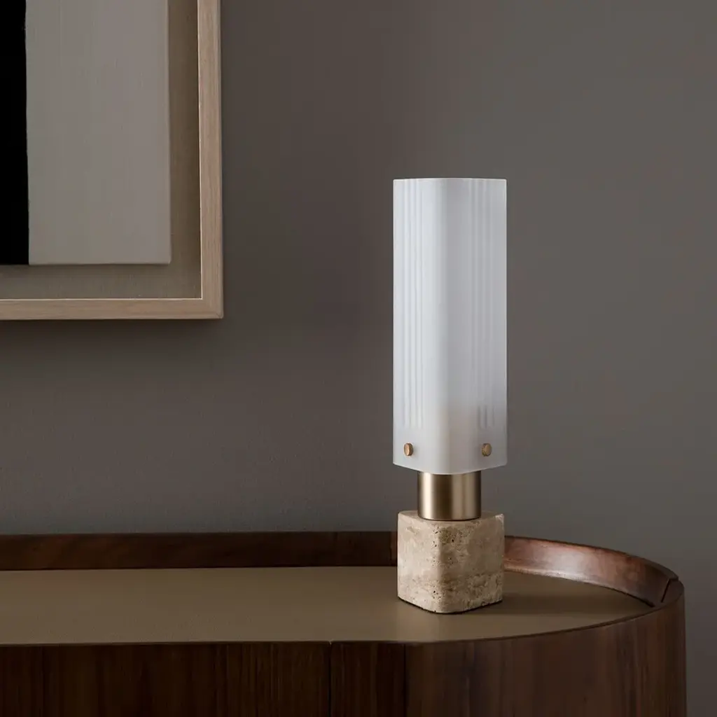 Halfway between Art Deco and Rationalism, the Strozzi table lamp is made from a triangular glass tube with fluted sides. Its relief makes the light vibrate with every movement, like a waving flame. The combination of sandblasted glass, champagne-coloured steel and travertine creates a balance between functionality and aesthetics. This lamp provides a soft, warm light. An Emmanuel Gallina creation, exclusively for AMPM.Triangular fluted sandblasted glass diffuserTravertine base (each piece is unique, the pattern may vary from product to product)Transparent PVC electrical cableHolder for GU10 lamp holderFor bulb (not included) LED 10W max