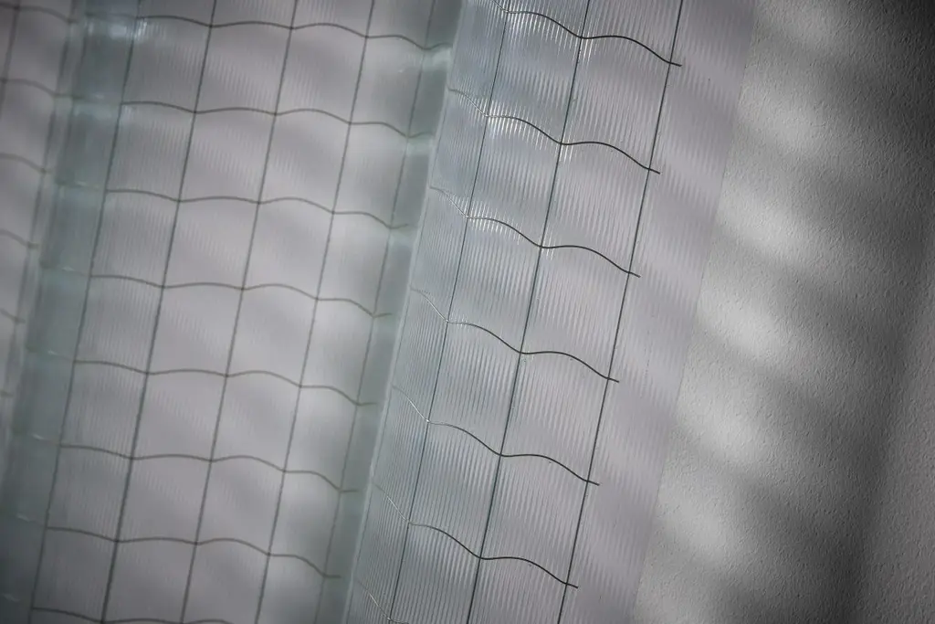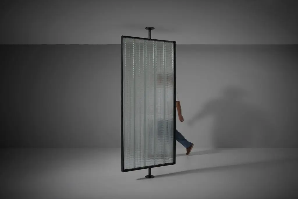 Exceptional corrugated glass panels by Saint-Gobain, France 1950s. Nice large panels from beautiful clear soft green tinted glass with metal wire inside, one smooth and one line structured side. The panels where produced in a small number for a short time by the well known French glass manufacturer Saint-Gobain. The panels would be beautiful as decorative wall panels, space dividers or any other architectural option. Unique opportunity to obtain these glass panels.We created these metal frames to be able to use the panels as moveable room dividers which can easily be clamped between floor and ceiling. The frames can be made in any length depending on the height of your ceiling, a large divider can also be created in the same way; unlimited length. On the other photos we mounted the panels on the wall with the use of metal hooks. We have a quantity of 16 panels available, all in very good condition.DIMENSIONS: Glass panel: L 200 x W 90 x D 6 cm / Frame: L 235 x W 94,5 x D 6 cm
