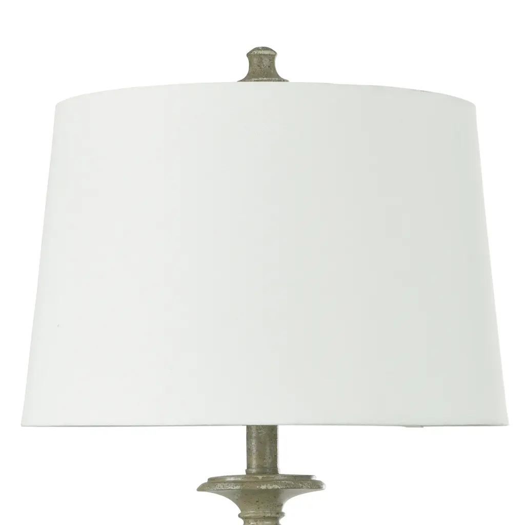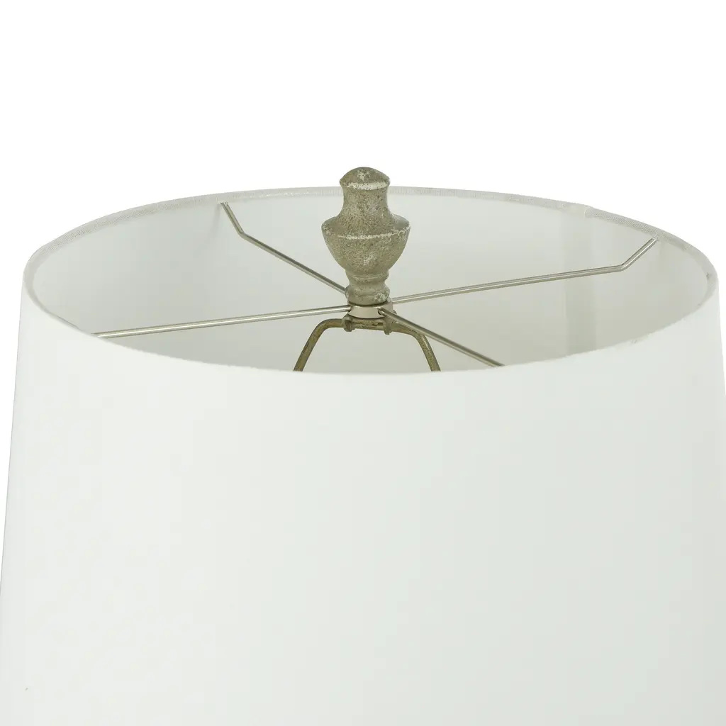 A classic candlestick styled body is styled with a distressed finish in this table lamp. Perfect for dressing up any table top, nightstand, or side table, this versatile table lamp blends in with traditional décor. Update the living room or bedroom with this beautifully designed addition.Due to the production process, each piece is unique and no two are exactly alike.This Lamp Body Is Composed Of Poly Resin In A Candlestick Shape.Depending on the bulb used - color of shade may appear slightly different when turned onDimensions: 15 inch wide x 31 inch highWeight: 5.98 poundsLamp Base Dimensions: Body: 17.75"H x 4.5"Dia; Base: 6.25"W x 6.25"D; Finial: 2.5"HShade Dimensions: Top: 13", Bottom: 15" length x Top: 13", Bottom: 15" wide x 10" highCord Length: 60"Socket Quantity: 1Bulb Shape: A21Socket Type: E26Light Bulb Type: Replaceable LEDLight Bulb Included: NoVoltage: 110VFixture Dimmable: No