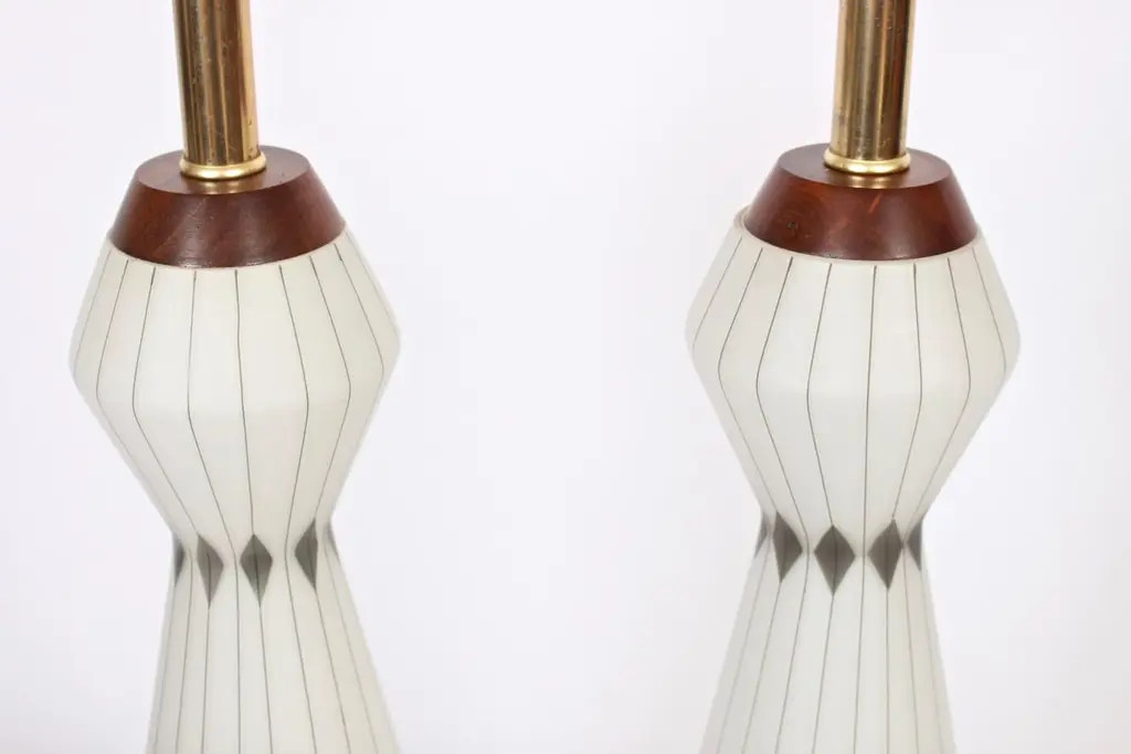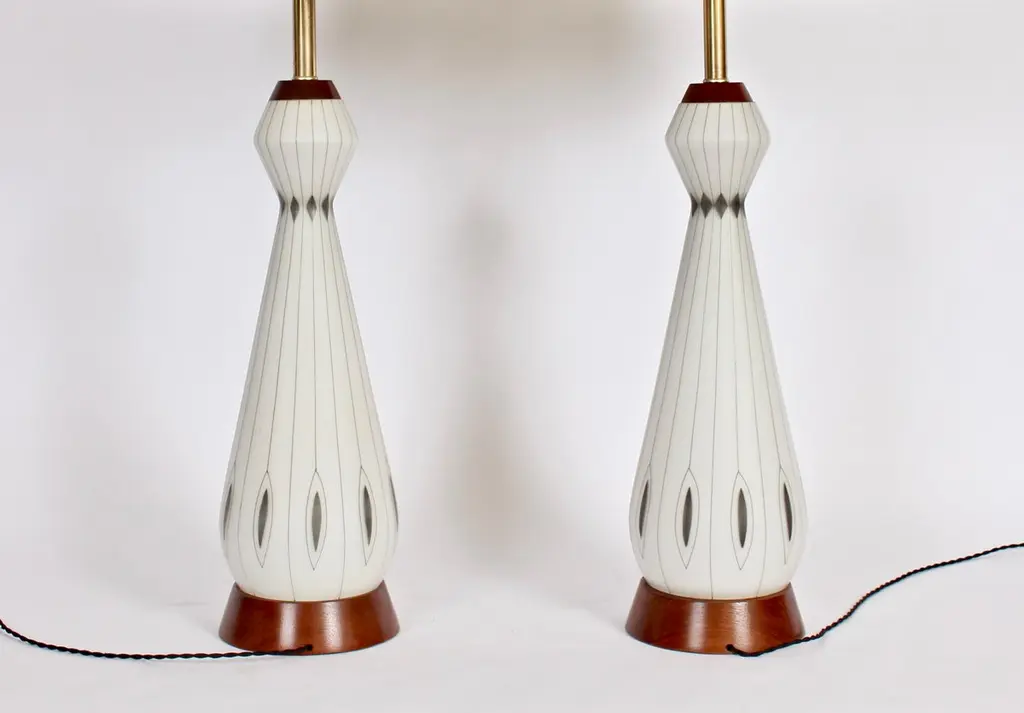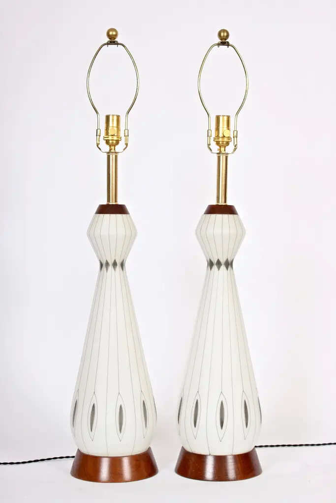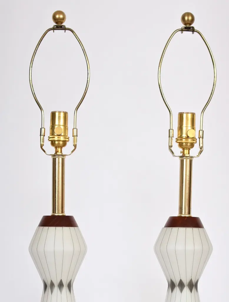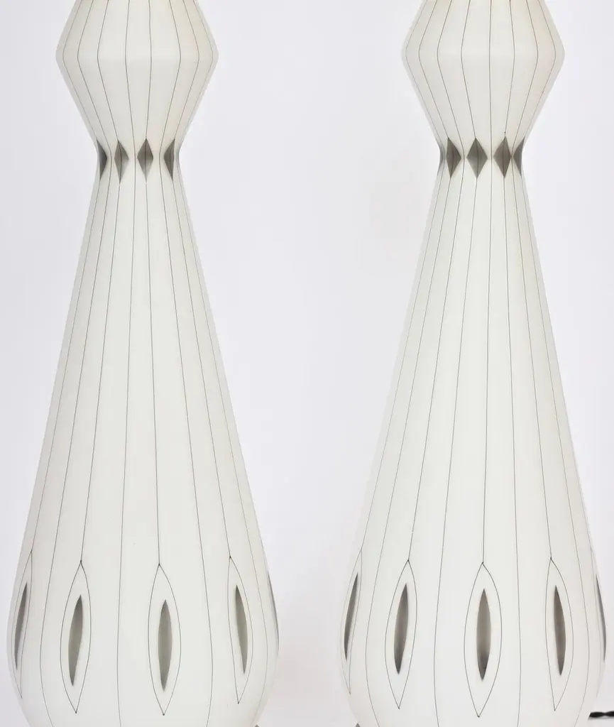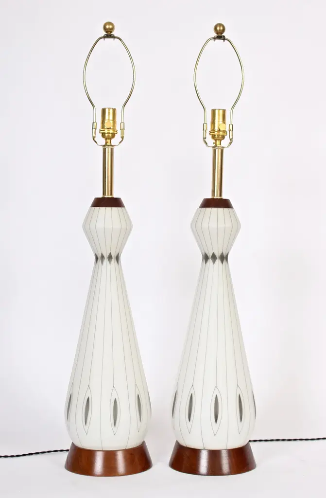 Monumental 36"H pair of white frosted glass table lamps with silver line. Featuring a modern translucent white frosted glass form, hand applied vertical silver line and cat eye decoration in patinated silver overlay. With Walnut cap and base. Brass neck. Small footprint. 30 H to top of socket. Unmarked