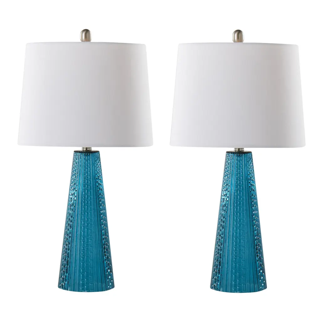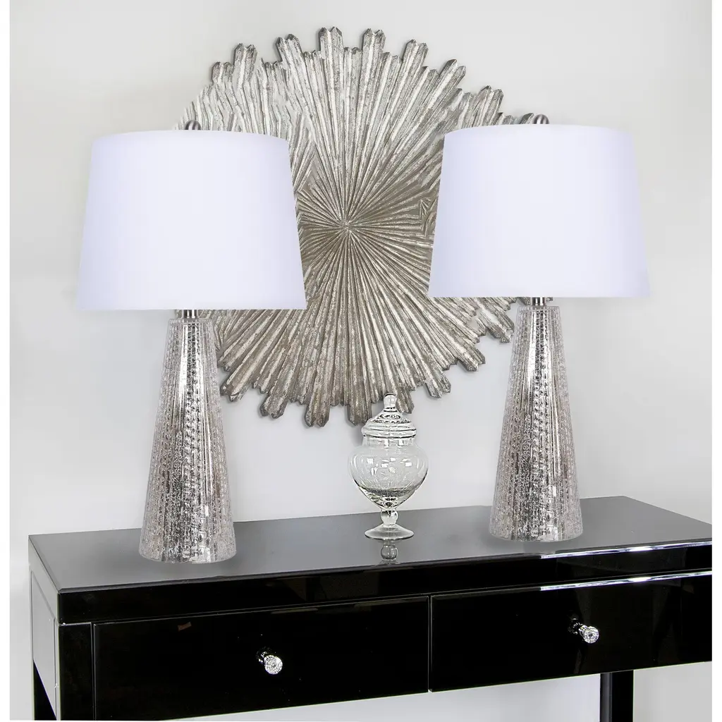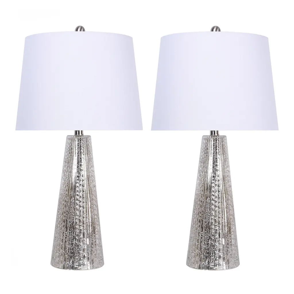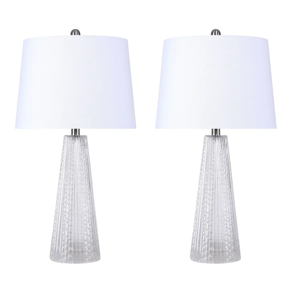 This set of table lamps is glamorous yet subtle; each lamp's base is elegantly tapered in such a way that it showcases its artfully textured glass. Yet with their off-white linen empire shades, muted coloring, and slim body, they will add style to your space without overwhelming it. Whether resting on a desk, on a bedside table, or a side table, these lamps are a lovely, vintage-inspired solution to your lighting needs.