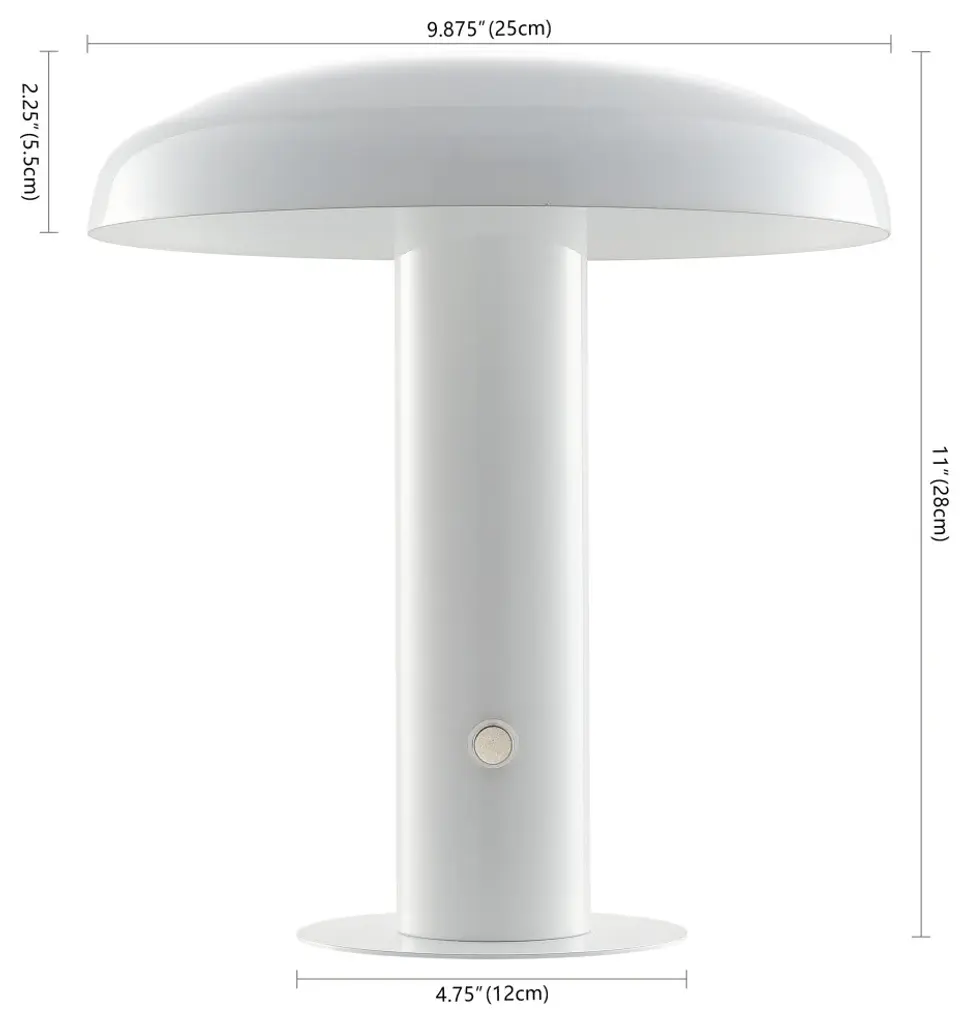 Add mid-century modern flair to your bar, console, or vanity with our portable accent lamp. This cordless, rechargeable lamp provides dimmable mood lighting for your dining room, living room, bedroom, or entry. The durable metal design features integrated LED bulbs and a touch sensor control with three brightness settings.Features:• The mushroom style shade and base are crafted from high-quality metal with a crisp white finish• Cordless, portable, dimmable lamp has a rechargeable battery for convenient accent lighting almost anywhere• Versatile 11" height is perfect for ambient lighting on a table, desk or console• Eco-friendly ed LED bulb included• Dimmable Integrated 2W LED Bulb• Color: White• Body Material: Metal• Includes: One (1) lamp• Assembly RequiredDimensions:• Lamp: 11 inches high x 9.875 inches wide x 9.875 inches deepAbout us:You see a lamp.We see a decorative work of art.A perfectly curved shade casts a dramatic shadow on a floor. Compatible with LED lightbulbs: as easy on the environment as they are on the eyes. The JONATHAN Y Lighting collection considers every detail from impeccably sourced materials to designer styling. And our prices are so attractive, we''ve transformed a functional necessity into a fashion accessory.JONATHAN Y Lighting - a fashion revolution in home decor.