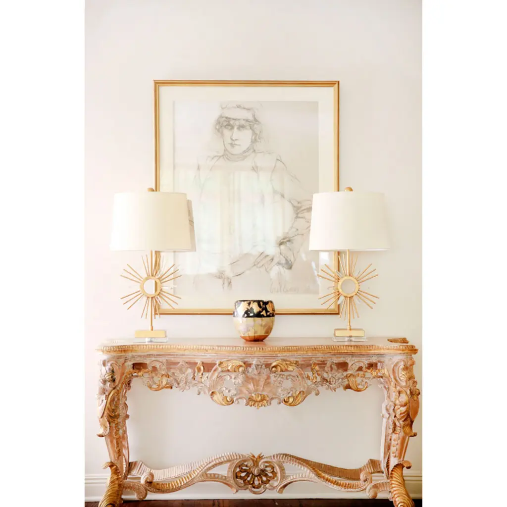 The Sun King Table Lamp is appropriately named, and brings the highly used architectural ornament, the sunburst as its design pattern. A focal point for sure, this lighting fixture mixing this theme with sophisticated finishes and crystal allowing for us to show off our Charming Modern Traditional Flair, and brings 30" of details to your design. Used as a Buffet Lamp as well, try putting a pair in your entryway to welcome your guest.