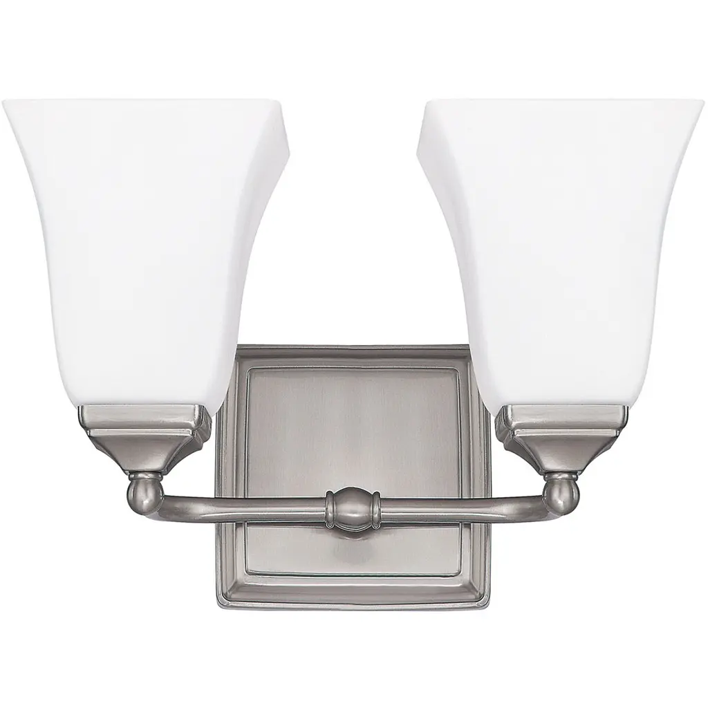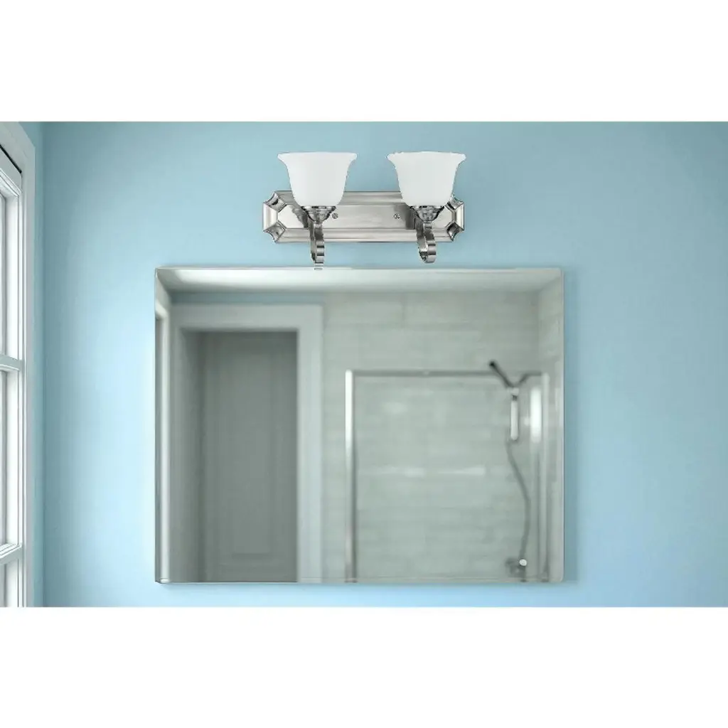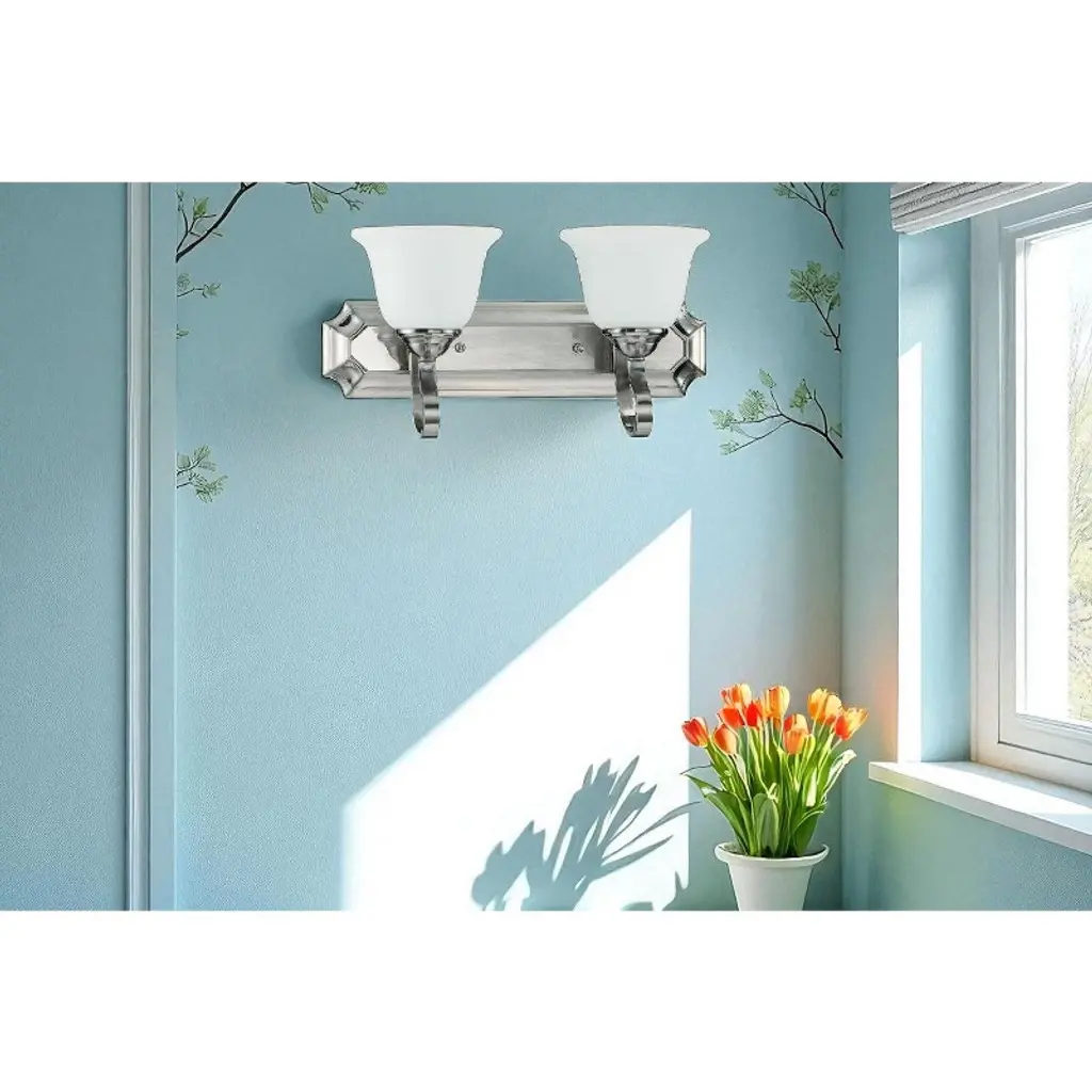 Sunset Alistair Two Light Vanity in Bright Satin Nickel A clean, contemporary 2-light vanity from the Alistair collection finished in Bright Satin Nickel. Designed for over-mirror use with standard medium-base bulbs to deliver bright, even illumination. Key Features: • Two-light wall vanity from the Alistair collection • Bright Satin Nickel finish complements modern interiors • Uses two E26 medium-base bulbs (100W max each, not included) • Durable metal construction • Compact 18" width fits small to medium vanities Specifications: • Item Number: F16062-80 • Collection: Alistair • Finish: Bright Satin Nickel • Material: Metal • Width: 18.00" • Height: 9.13" • Lamping: 2 × E26 medium base, 100W max each