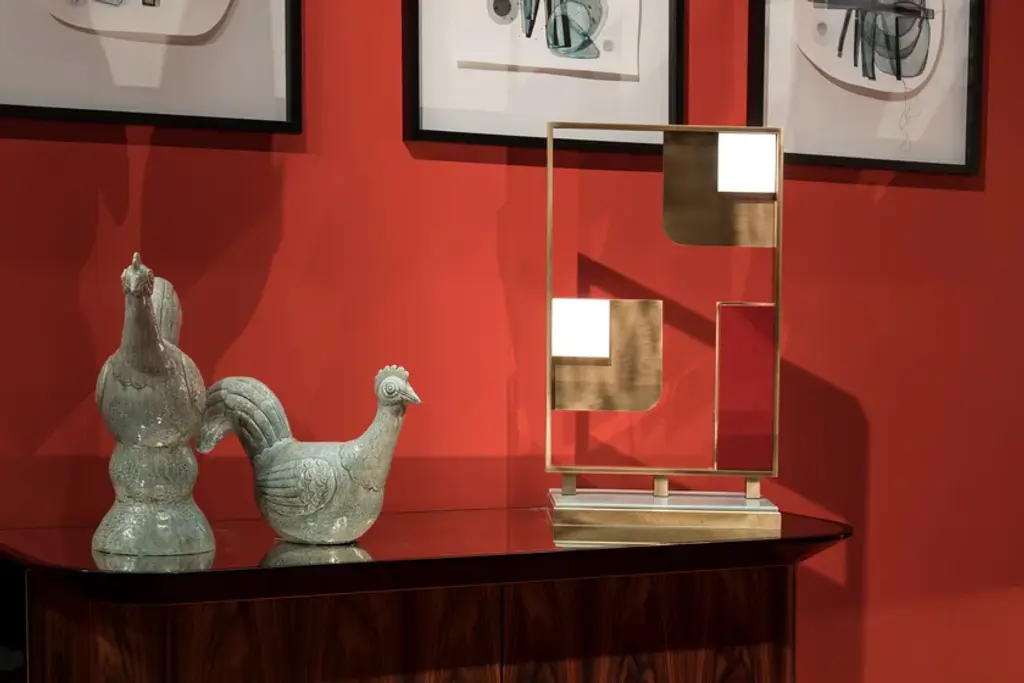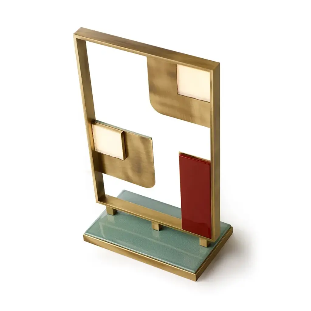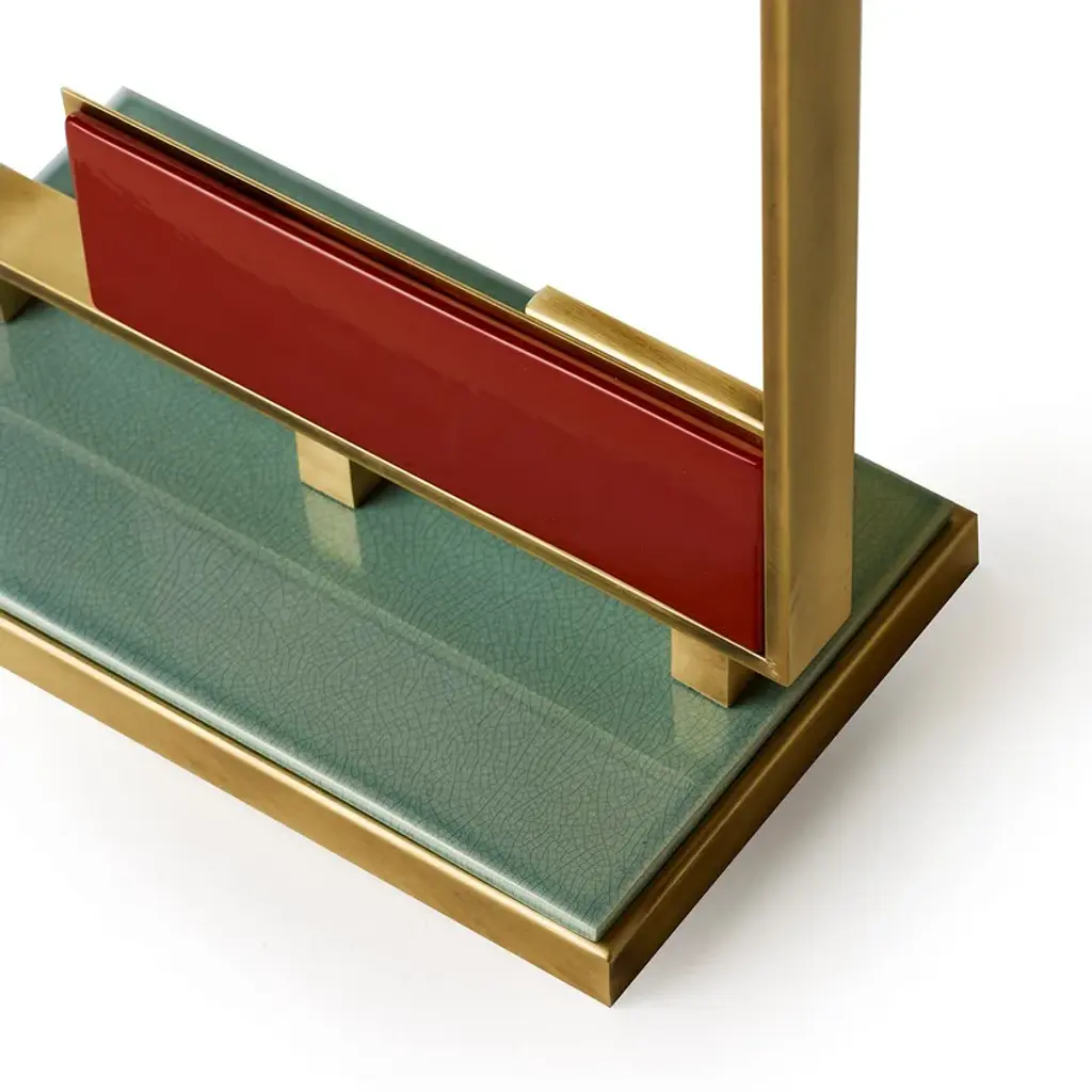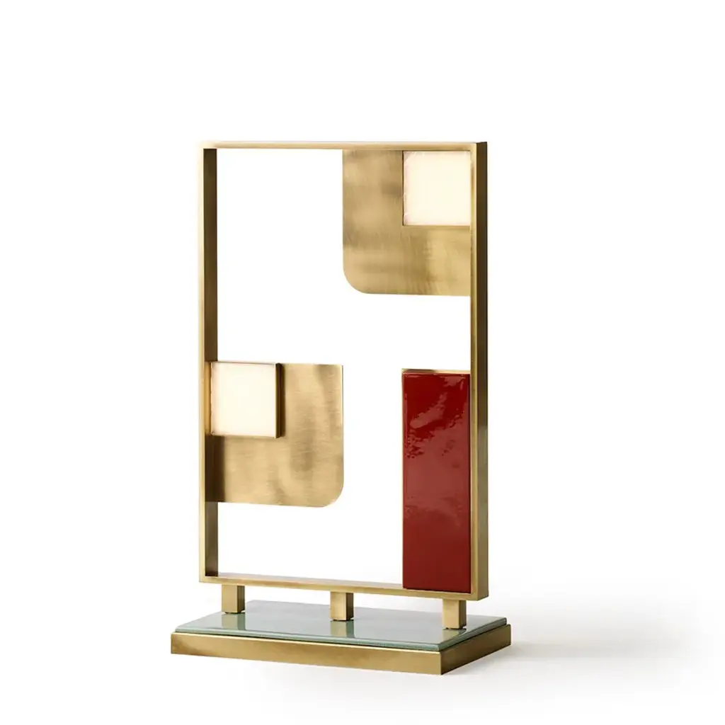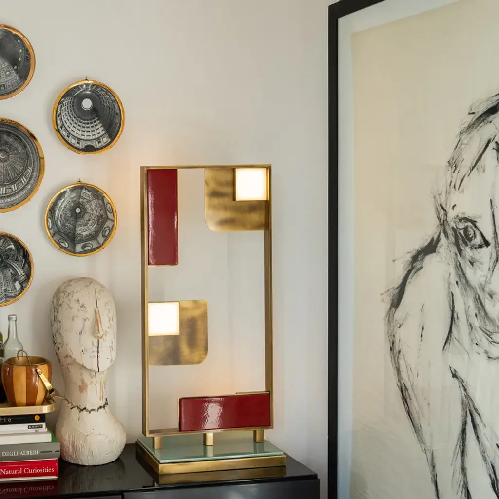 Medium table lamp in brushed brass with glazed ceramic tiles. Light source OLED by LG