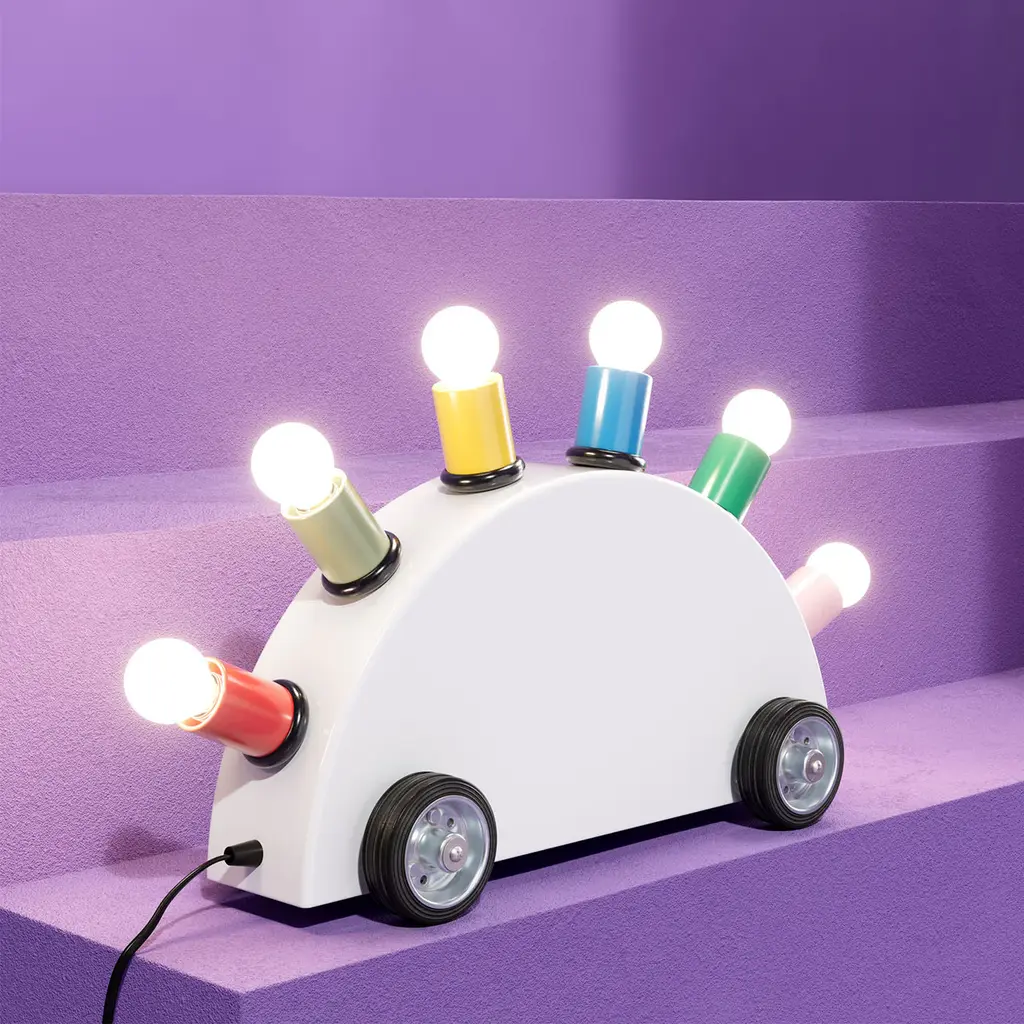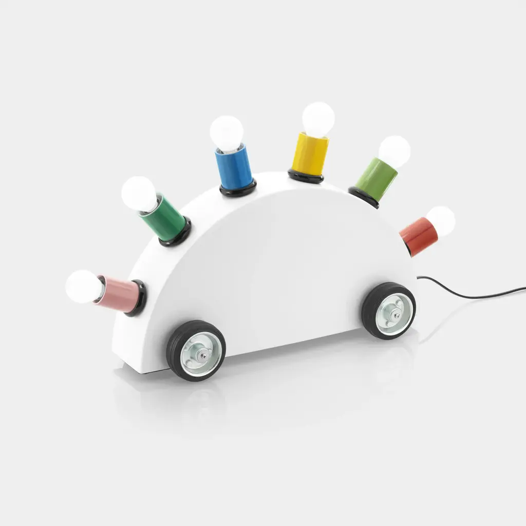 A superlative piece of eclectic design, this table lamp is part of a series created in 1981 by Martine Bedin for Memphis. A striking accent piece for any contemporary decor, it is entirely fashioned of fiberglass boasting a white hue on its car-shaped structure, and six different colors in the cylindrical lightbulb support. Please ask the Concierge for additional details.