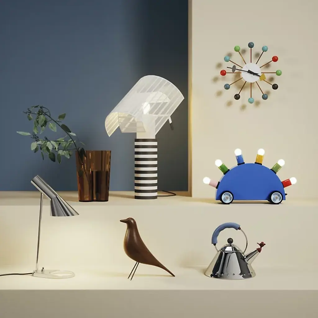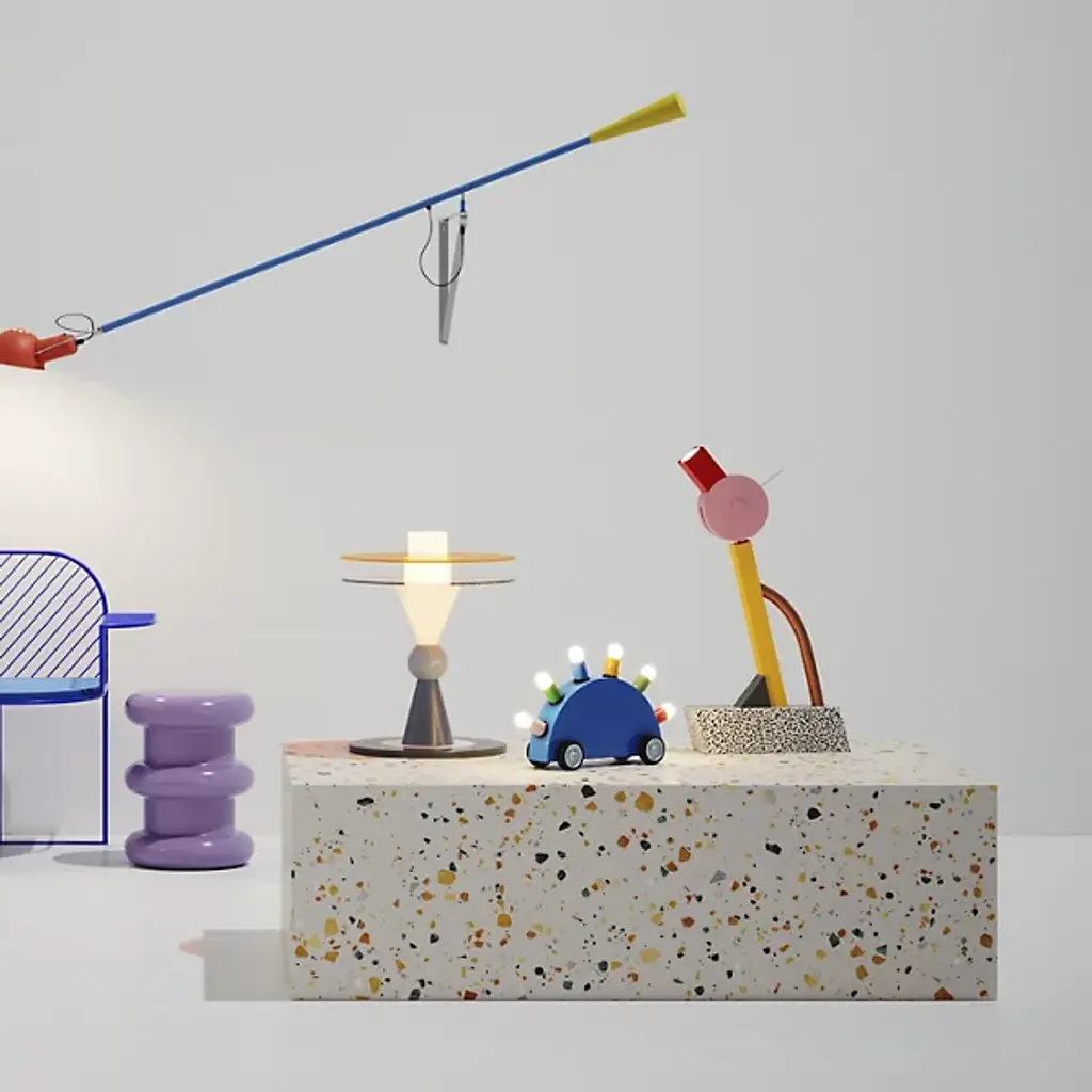 Designed by Martine Bedin, the Super Table Lamp from Memphis Milano cruises into one’s home with an unforgettable radiance and sense of play. Bedin’s work uses color and shape to communicate expressiveness and playfulness. Bedin evokes the car with a rounded body that sports a group of charming wheels. Refined cylindrical lamp holders follow the circular outline of the body with a diverse set of colors. Bare bulbs slot inside to produce a brilliant, undisturbed light.