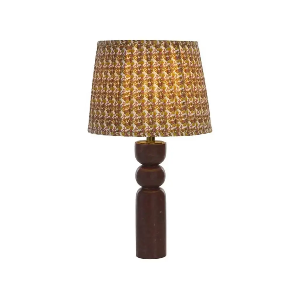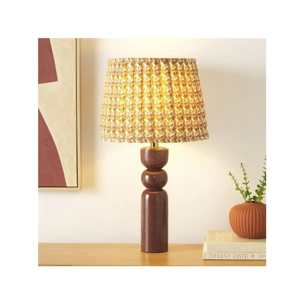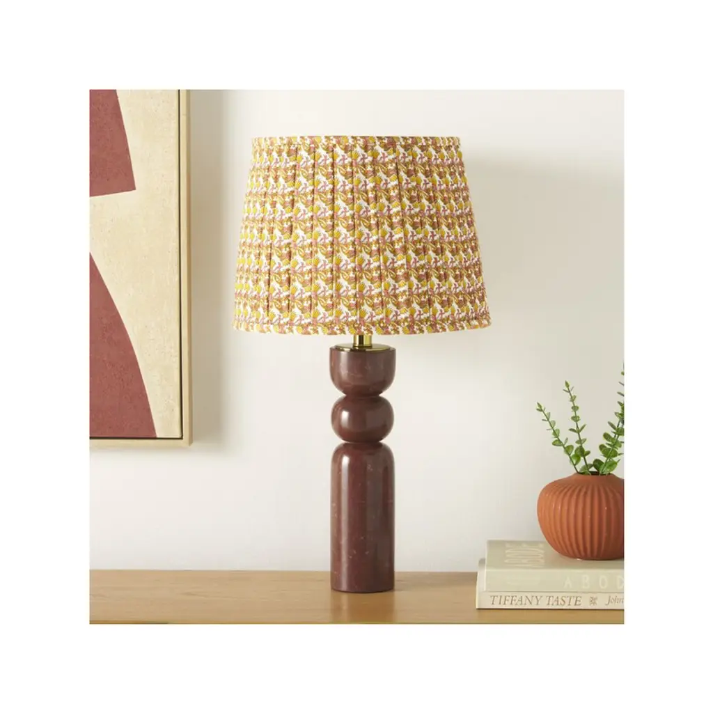 Product Ships in 2 Seperate Boxes. Introducing the Suraya Table Lamp: a statement piece that combines classical elegance with modern sensibilities. Impress your guests with this sophisticated deep red marble-bodied lamp, paired with a delicately patterned fabric shade to create a warm, inviting glow. The solid marble base stands proudly, embodying durability and stability, while the fabric shade softens the light to create a cozy ambiance in any room. Elevate your decor with this exquisite piece that is both functional and a testament to tasteful design.