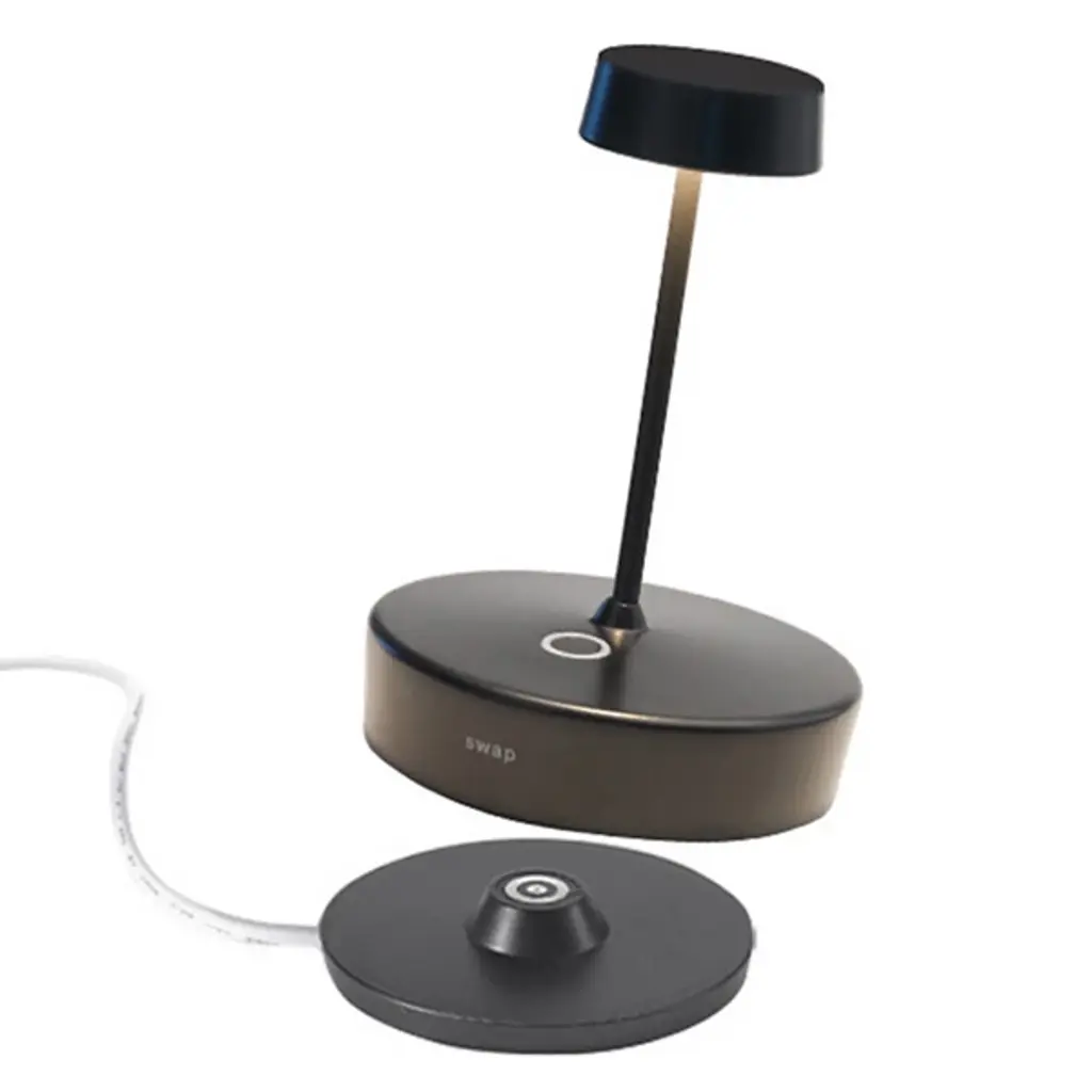 The Swap Pro Rechargeable LED Mini Table Lamp from Zafferano America is a compact, rechargeable, battery-powered cordless table lamp designed for indoor and outdoor use (excluding gold and silver finishes). Featuring a touch control on the base for easy on/off functionality and dimming, this lamp combines convenience with a sleek design. Its electronic control system monitors battery life, ensuring a consistent luminous output until fully depleted. Optimized recharging is done via the included contact charging base, though the battery charger is sold separately.