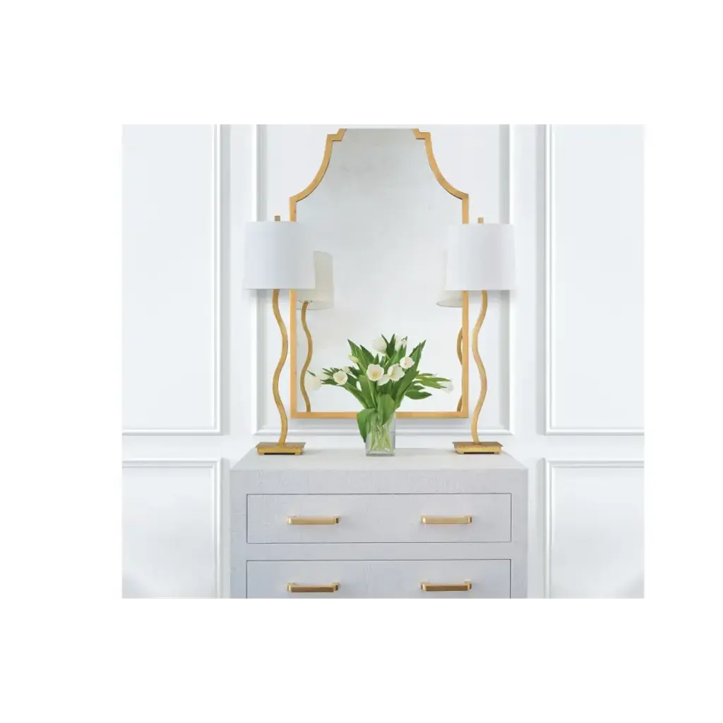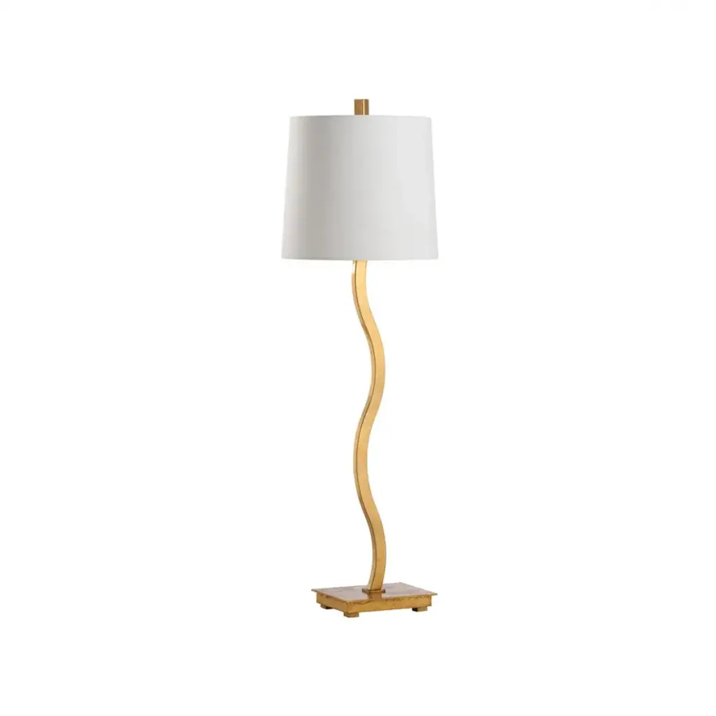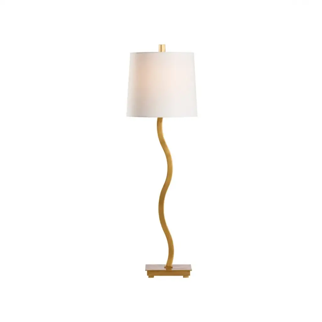 This elegant lamp features a slender silhouette with subtle curves that add a touch of grace to its design. Finished in a warm gilt, it exudes a timeless sophistication, casting a soft, inviting glow. Perfect for classic and contemporary spaces alike, it blends luxury with charm. Designed by Jamie Merida.