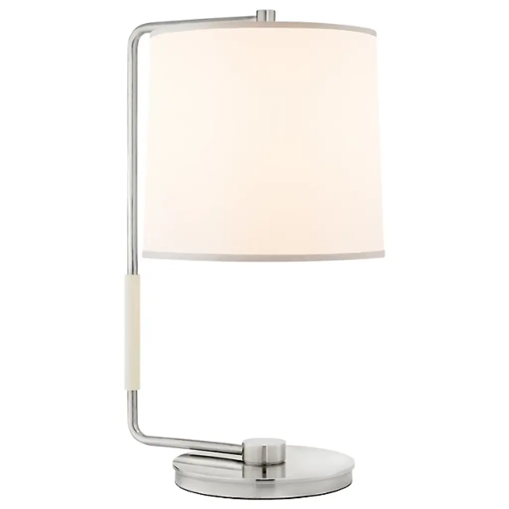 With its adjustable design and warm ambient lighting, the Swing Table Lamp by Visual Comfort Signature, formerly known as Visual Comfort, is a welcome addition to a variety of contemporary settings. Its body consists of a low-profile base and dramatically curved stem (with a soft White accent), both of which support a rounded Silk shade. Once on, internal light sources glow through the opaque material, creating a pleasant, useful illumination ideal for desks and reading tables.