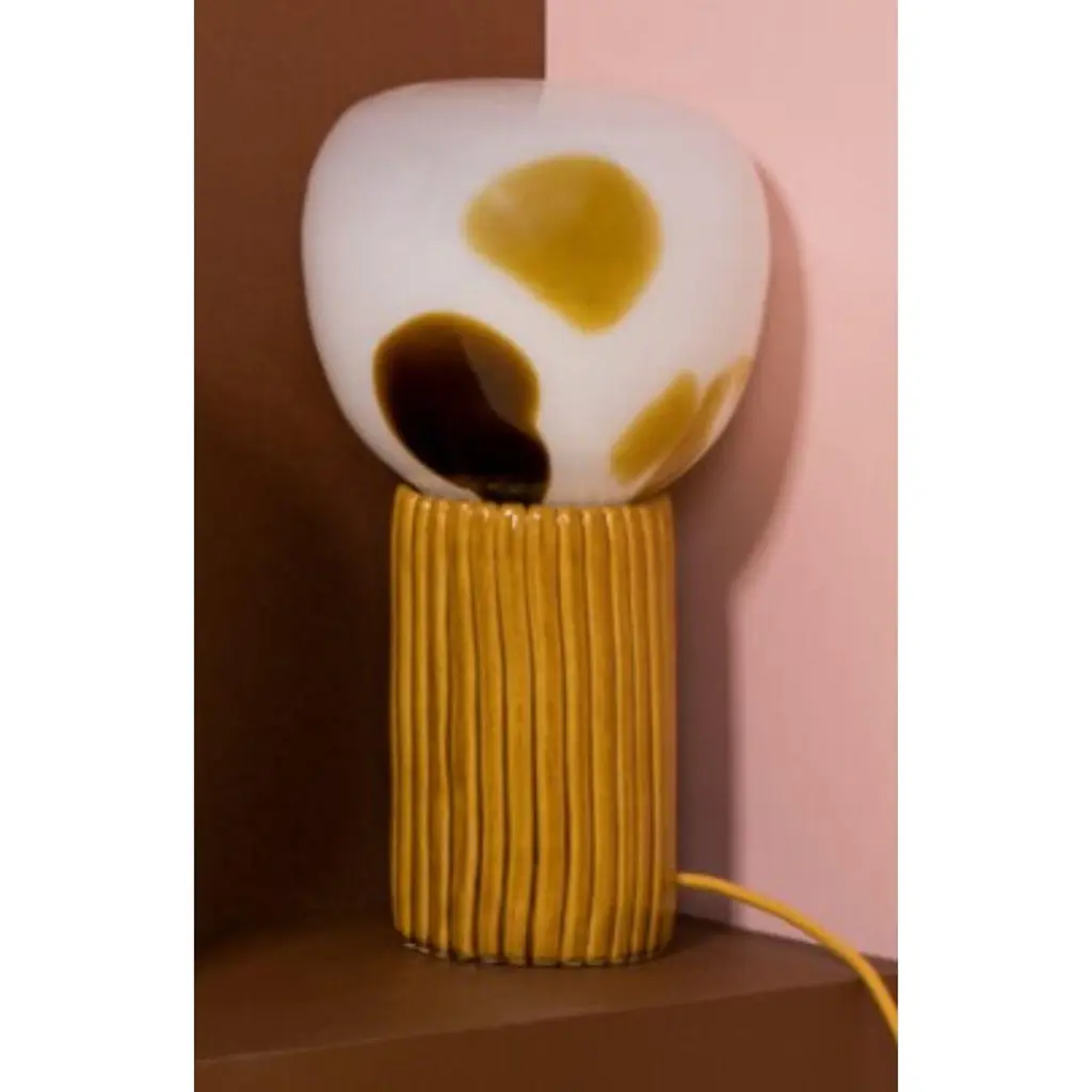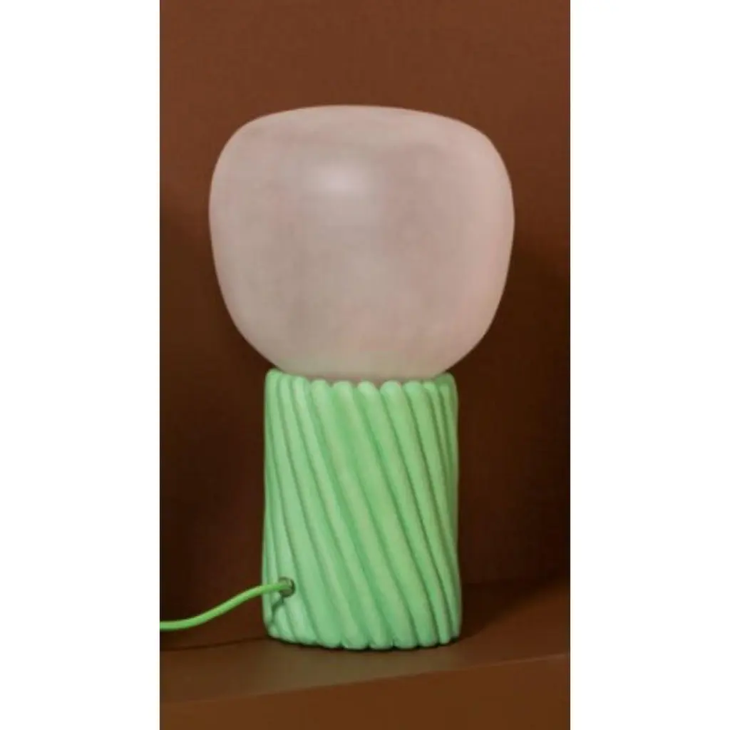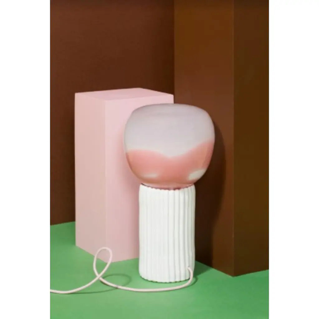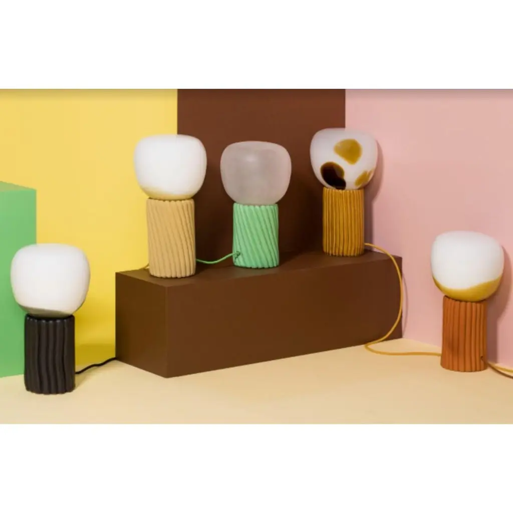 Swirl lamp by Tero KuitunenMaterial: Hand blown glass, hand built ceramic, textile cable.Dimensions: D23 x H38 to 43 cmLimited editionGlass parts done in a Collaboration with Nuutajärvi glass village.Also available in different colours and height.All our lamps can be wired according to each country. If sold to the USA it will be wired for the USA for instance.Designer Tero Kuitunen, b. 1986, is inspired by the interface of design and art, the unprejudiced apposition of things, floating sceneries, and the meaning of humor and touch in design. Alongside product design, Tero is known for concept and space planning as well as memorable projects of contemporary art and design. He has graduated as a designer from the Applied Arts MA program at the Aalto University School of Art, Design and Architecture. Tero works as a product, concept and interior designer in projects for clients such as Supercell, Absolut Vodka, Hakola and many more. Currently Tero is working as a freelance designer with a vast experience in the design and art field. He has participated in international exhibitions and fairs in e.g. Beirut, Stockholm, Japan and Italy. 2019-2020 he curated and created the concept for Wild at Heart exhibition that toured to Vienna, Budapest, Stockholm, Tokyo and Helsinki. In 2021 Tero was invited to create together with Karoliina Hellberg and Raimo Saarinen a new exhibition at the prominent Amos Rex Museum. Tero has received a one-year working grant from the Finnish Cultural Foundation in 2017 and projects grands from Arts Promotion Centre Finland and City of Kotka.Throughout his work, Tero wants to find something that moves and touches people. Materials and colours are often his biggest inspiration when starting a new design project.