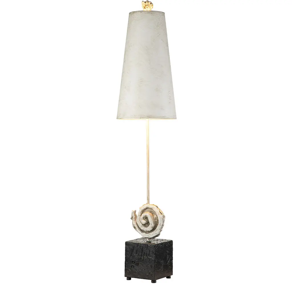 Swirl Table Lamp in Bone White finish. Sculpted element atop a black base and antiqued shade make this Buffet Lamp a standout.