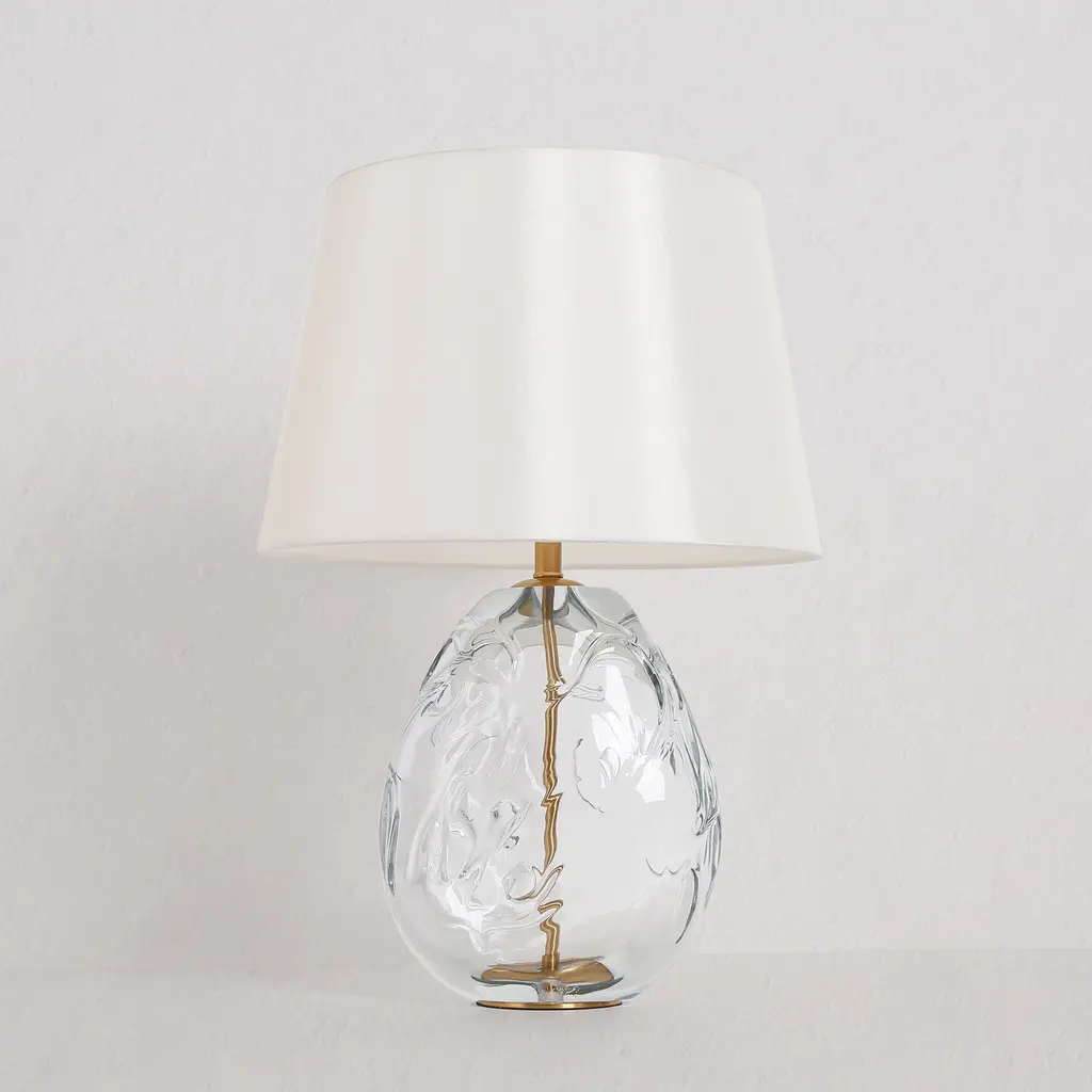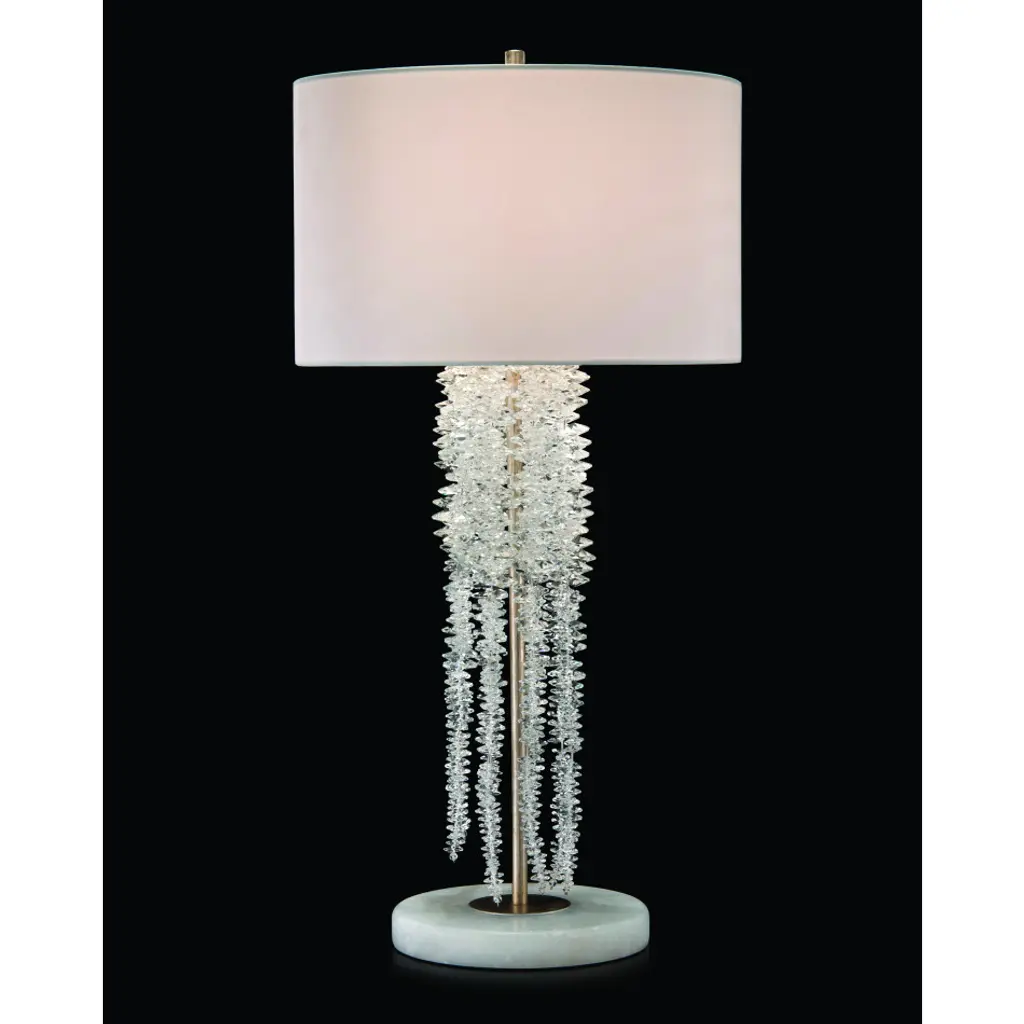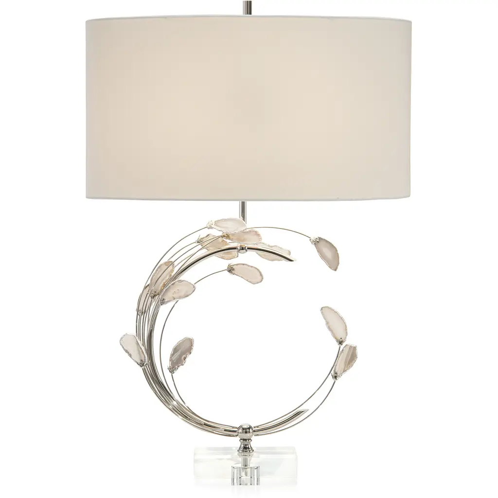 32"H Agates with cool gray tones appear to create dimension and movement in this beautifully crafted table lamp. Shade: (22" X 12") X (22" X 12") X 12", White outside and inside, Cotton and Man-Made Silk, Oval. 3 Way, 150 Watt Max, Type A Bulb, 10.5"