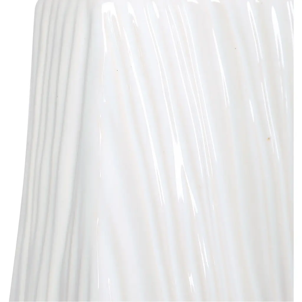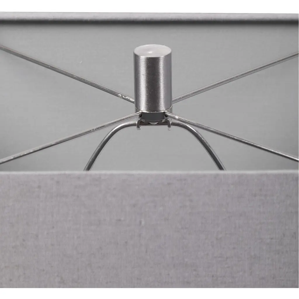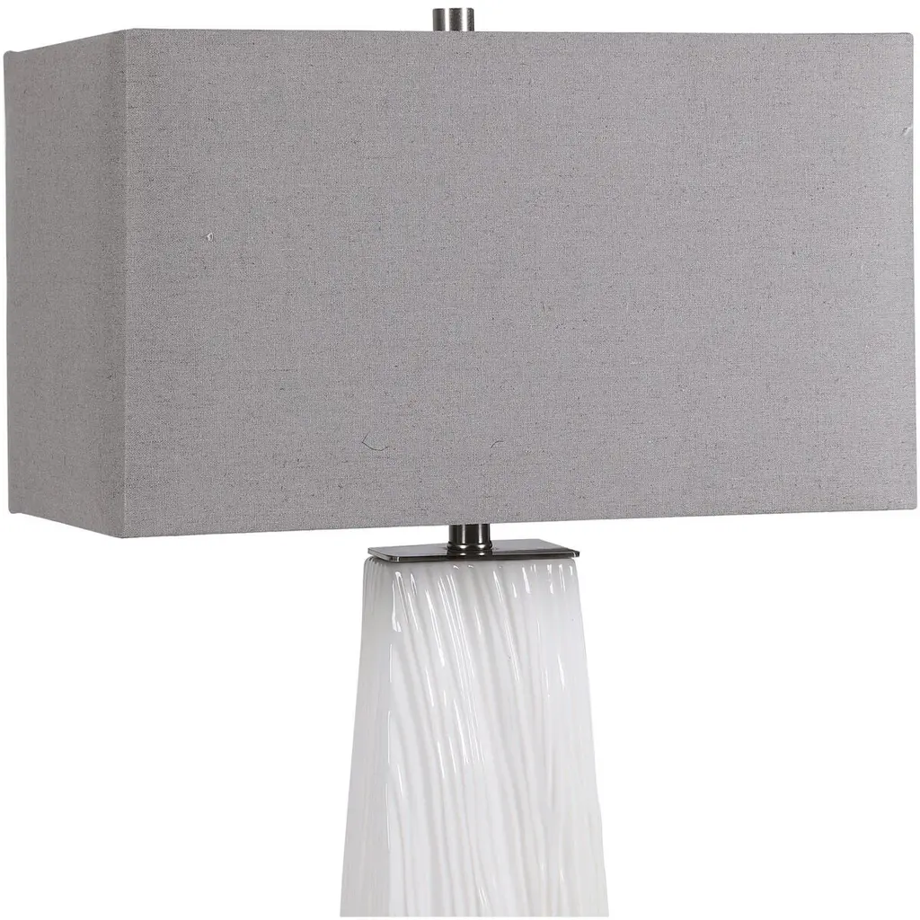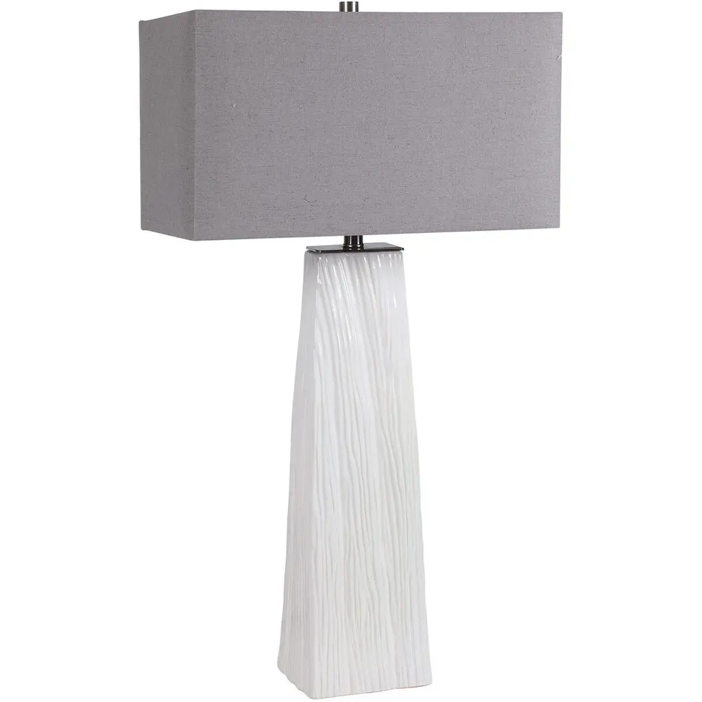 Elegant And Versatile, This Table Lamp Features A Gloss White Ceramic Base Featuring Organic Hand Carved Details And Brushed Nickel Accents. The Piece Is Paired With A Rectangle Hardback Shade In Gray Linen Fabric With Natural Slubbing.