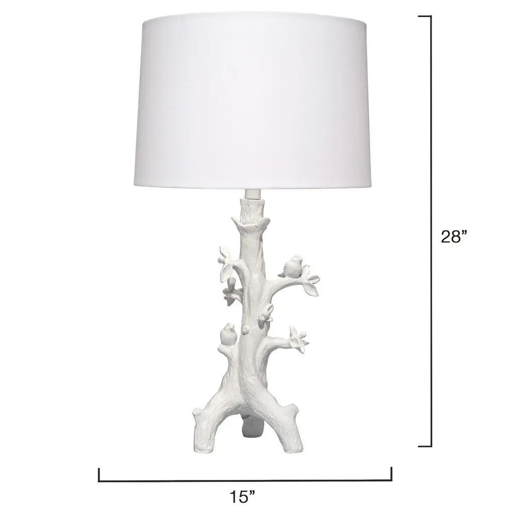 Artisans crafted the trunk-like base of this charming lamp from top-quality resin. Adorned with whimsical songbirds and sprouting leaves, its matte white finish paired with a white linen drum shade creates a clean and inviting look. A delightful bird-shaped finial completes the design. Place one on a side table, add a cozy chair, and you’ve created the perfect nook for story time.