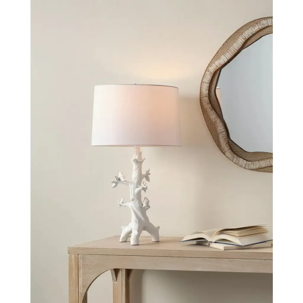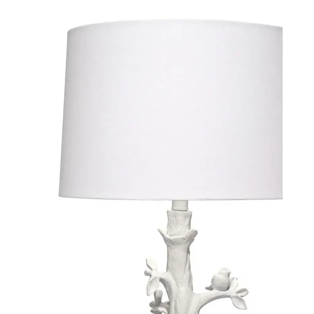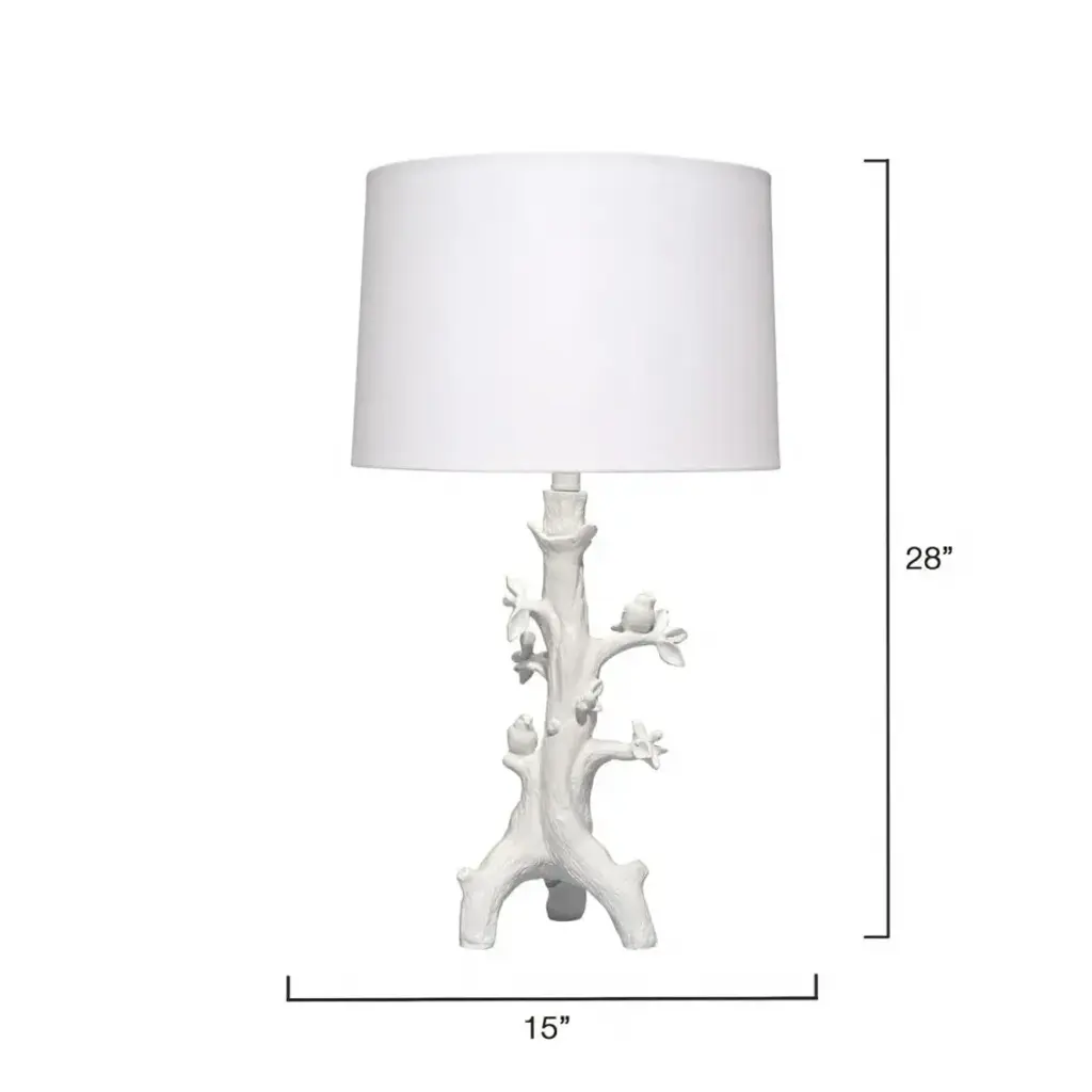 Artisans crafted the trunk-like base of this charming lamp from top-quality resin. Adorned with whimsical songbirds and sprouting leaves, its matte white finish paired with a white linen drum shade creates a clean and inviting look. A delightful bird-shaped finial completes the design. Place one on a side table, add a cozy chair, and you’ve created the perfect nook for story time.