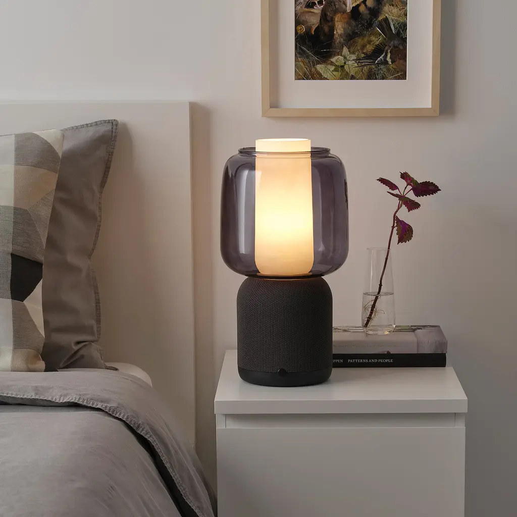 SYMFONISK Sonos speaker lamp, glass shade - black. All SYMFONISK speakers connect over WiFi so you can create the system you want in your home. Play a podcast in the bedroom while someone else listens to music in the living room, or group all your speakers to play music in sync.