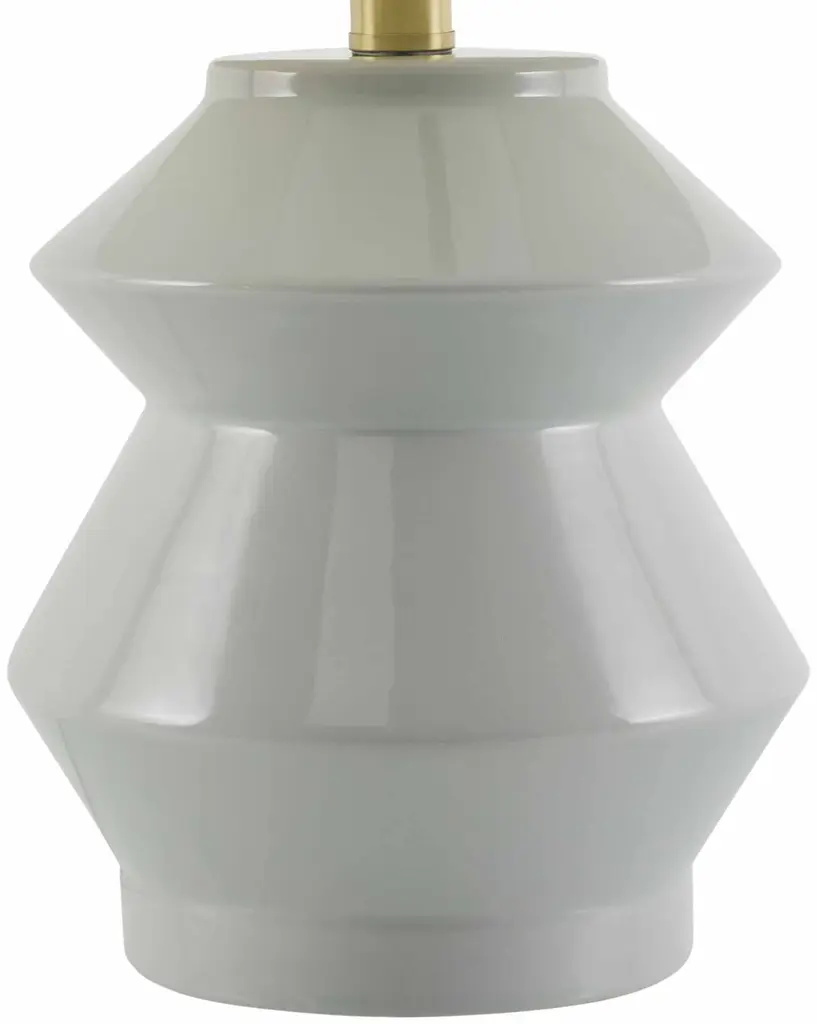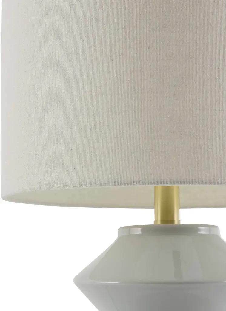 Collection: Tabaquite Colors: Green, Cream, White, Metallic - Brass, Translucent Material: Body: Ceramic / Shade (Outside): Linen / Shade (Inside): Polystyrene / Finial: Iron Styles: Contemporary Made In: China Lighting Type: Accent Table Lighting Shade Material: Linen, Polystyrene Shade Color: White, Cream Cord Length: 6' Switch Type: On/Off Number of Bulbs: 1 Socket Type: E-26 Bulb Wattage: 60W