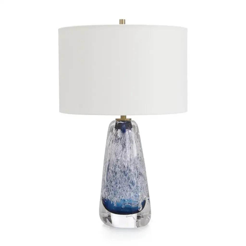 The design of this art glass table lamp in sapphire blue is surround by clear glass and blown air bubbles.