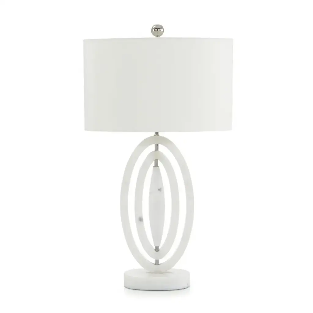 A trio of white marble oval rings mounted on a white marble base create this elegant table lamp.