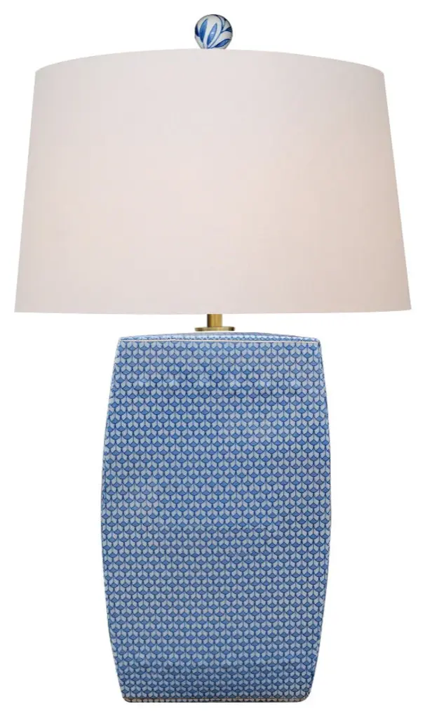 The whimsical design of Alexis Table Lamp adds a enchanting accent in any room. Perfect table lamp for the living room, bedroom, den and office. A round corset-shaped lamp shade is covered with printed fabric. A decorative blown glass element is set into a round metal base. This lamp is equipped with a single bulb socket and is finished with beaded pulls and a beaded finial. Proudly made in the USA by Kinzig Design Studios. Handcrafted in the USA! This fixture usually ships in 2-4 weeks. This item ships for free to the lower 48 states. • • Please note that the price listed pertains to a fixture that will appear very similar to the light shown in the featured photograph and as outlined in the accompanying description. Made with UL Listed parts. For use with a single standard incandescent lightbulb of up to 60-watt max (included). Can be used with an LED lightbulb of up to 100-watt max.