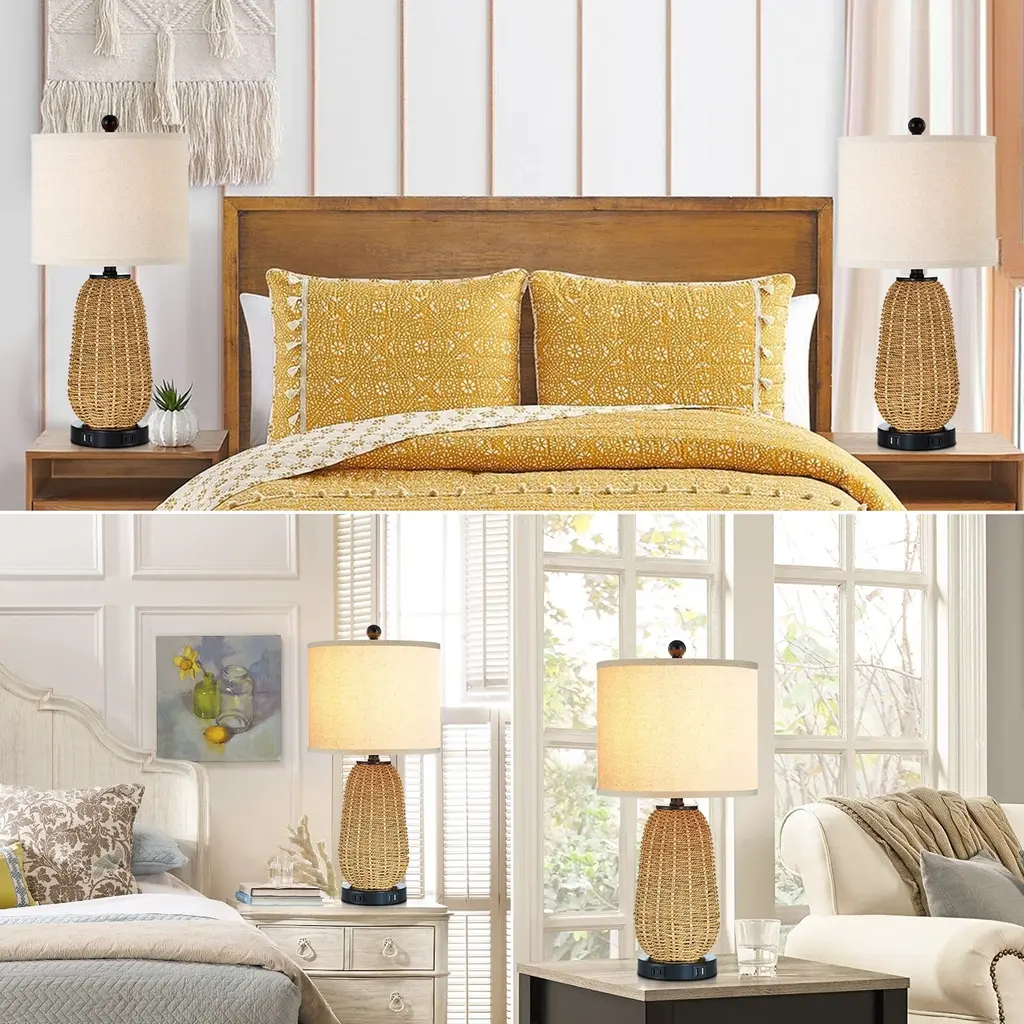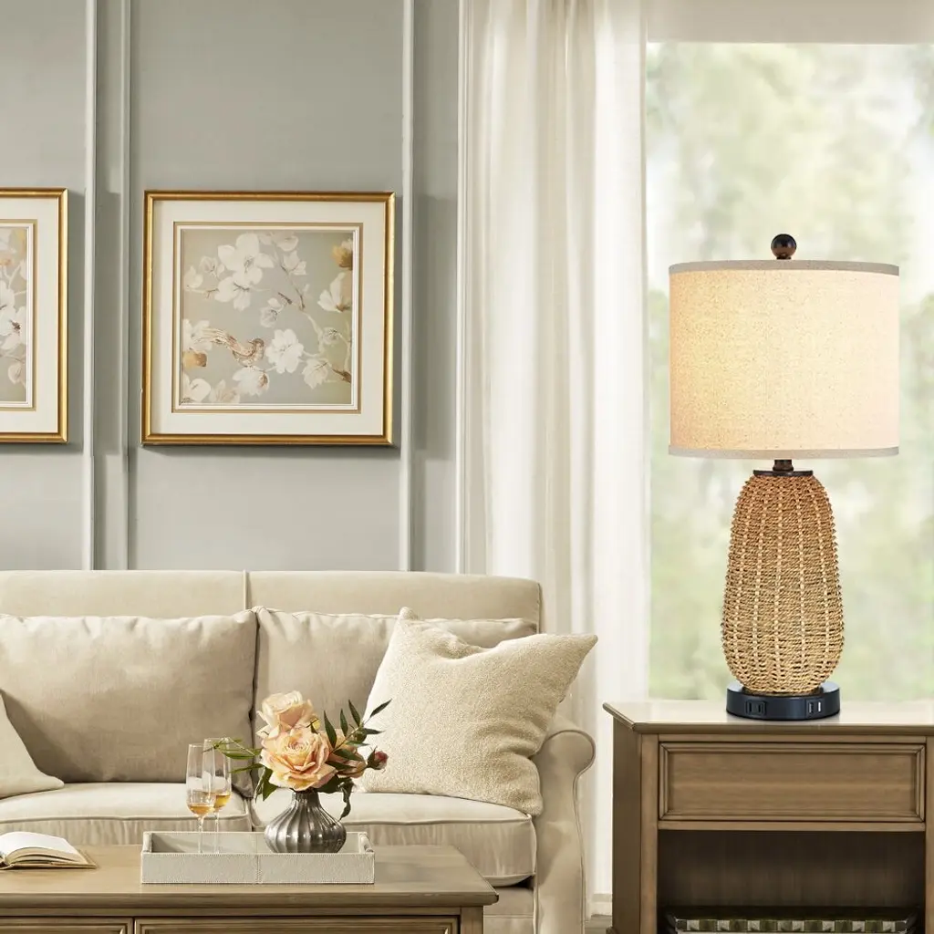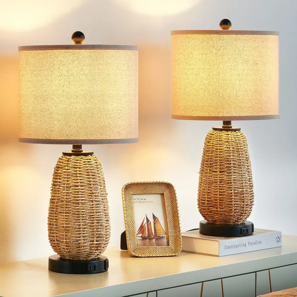Each lamp is gracefully adorned with a linen lampshade, casting a soft, diffused light that envelops your space in a warm and inviting glow. The metal base of each lamp features built-in dual USB charging ports. Now, you can conveniently charge your smartphone, tablet, or other smart devices without the hassle of finding additional sockets. With the 3-level dimming switch, you have versatile lighting options at your fingertips. Adjust the brightness to create the ideal atmosphere, from cozy evenings to productive work sessions. Need an extra outlet for your laptop, hairdryer, or another electronic device? Our lamps are equipped with a built-in Type-A socket, ensuring that you have the flexibility and convenience you deserve. These lamps support E26 bulb bases, making it a breeze to replace bulbs when needed, with a maximum wattage of 25W per bulb. Our lamps feature a natural straw frame. Add a touch of sophistication to your home with this classic design element.Overview of features: