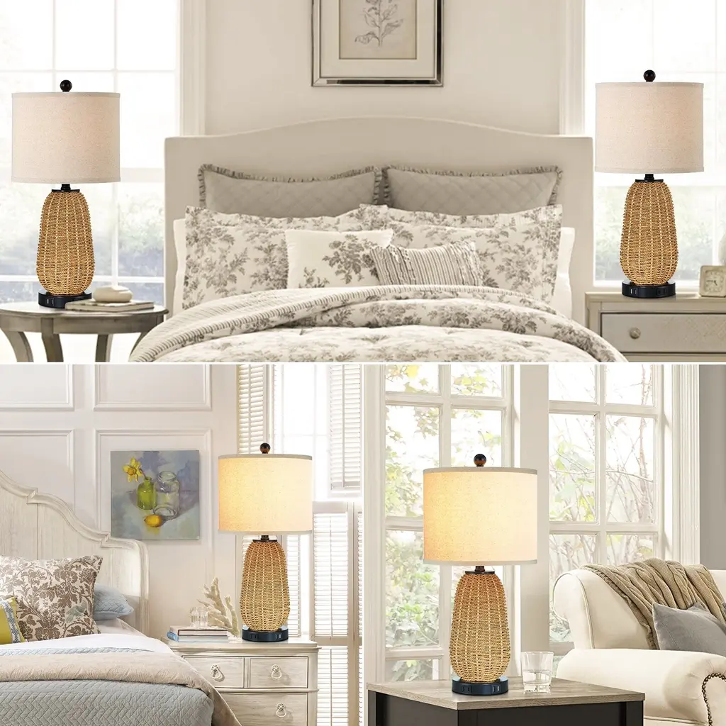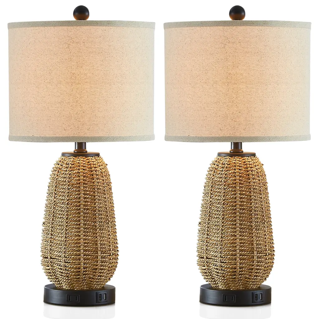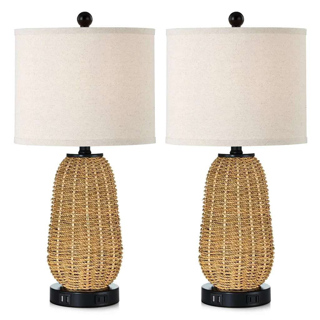 Each lamp is gracefully adorned with a linen lampshade, casting a soft, diffused light that envelops your space in a warm and inviting glow. The metal base of each lamp features built-in dual USB charging ports. Now, you can conveniently charge your smartphone, tablet, or other smart devices without the hassle of finding additional sockets. With the 3-level dimming switch, you have versatile lighting options at your fingertips. Adjust the brightness to create the ideal atmosphere, from cozy evenings to productive work sessions. Need an extra outlet for your laptop, hairdryer, or another electronic device? Our lamps are equipped with a built-in Type-A socket, ensuring that you have the flexibility and convenience you deserve. These lamps support E26 bulb bases, making it a breeze to replace bulbs when needed, with a maximum wattage of 25W per bulb. Our lamps feature a natural straw frame. Add a touch of sophistication to your home with this classic design element.Overview of features: