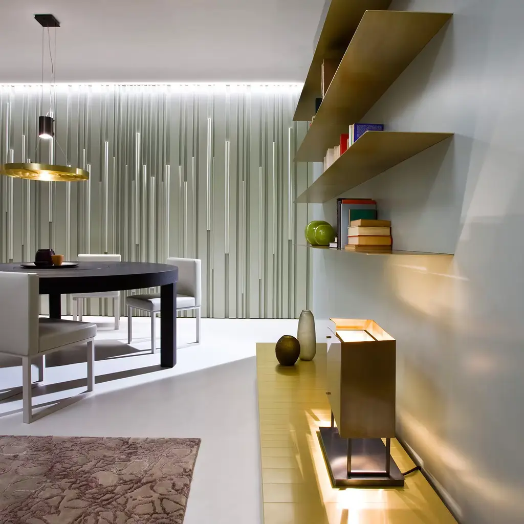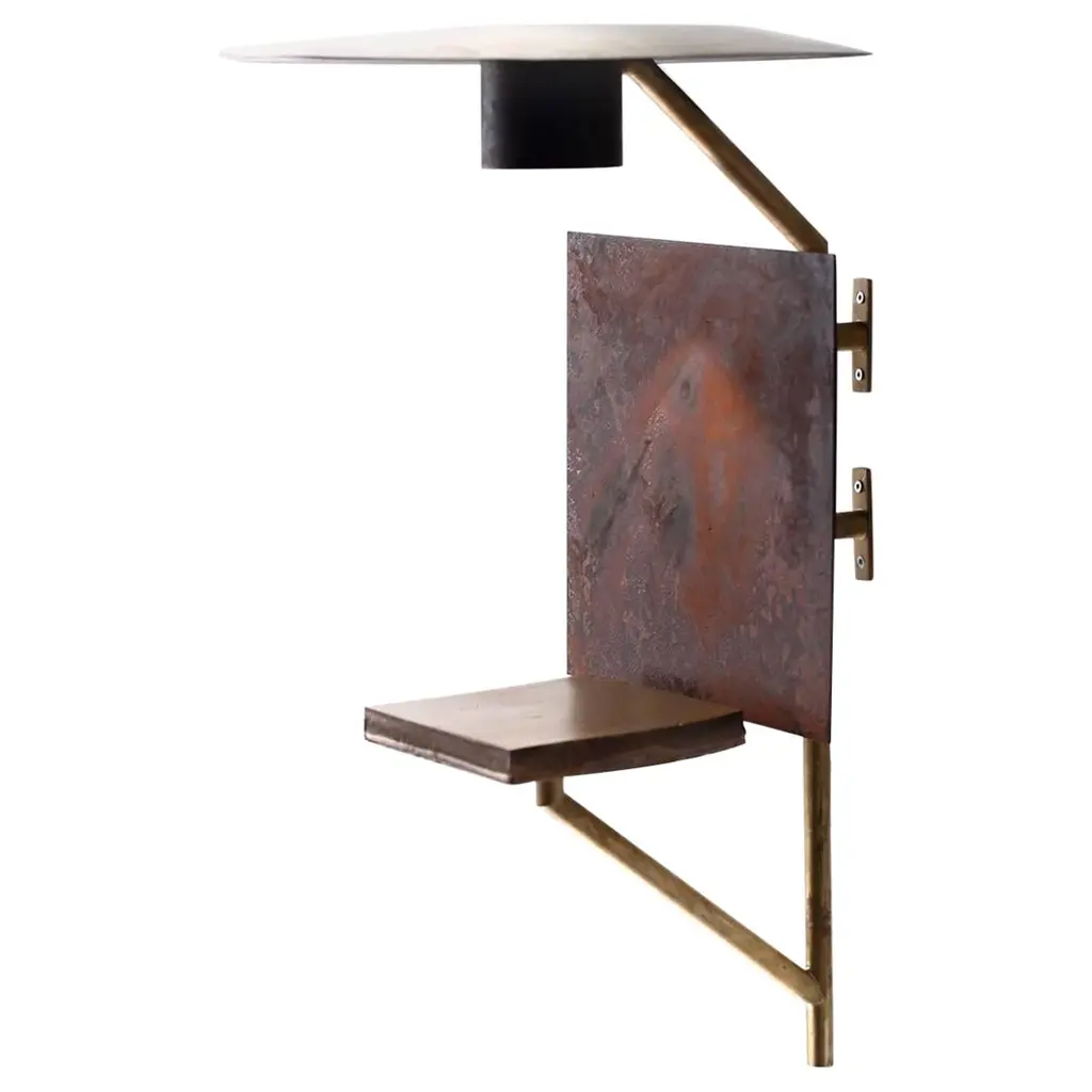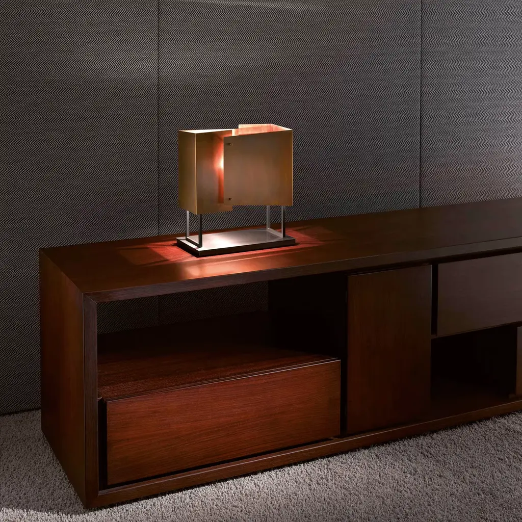 Table lamp features a brass structure with a black nickel finish, while the shade is in burnished brass. This is a unique lighting object, ideal for elegant environments. The dynamic effect of the multi-faceted geometrical components of this piece make it a sophisticated, modern lamp.