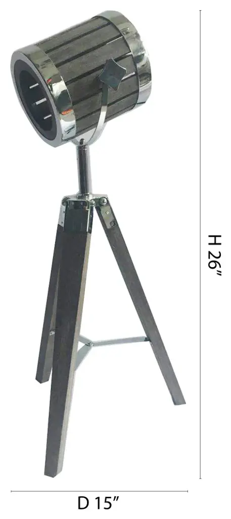 This modern table lamp is in a chrome finish. The frame is made out of metal with wood tripod legs. It has a wood shade with metal hardware, and it also comes with a plug in ON/OFF switch. This table lamp is great for chair side reading or general room illumination. Perfect for living room, dining room, and bedroom.Bulb(s) Included: NNumber of Bulbs: 1Bulb Type: E26Wattage: 60
