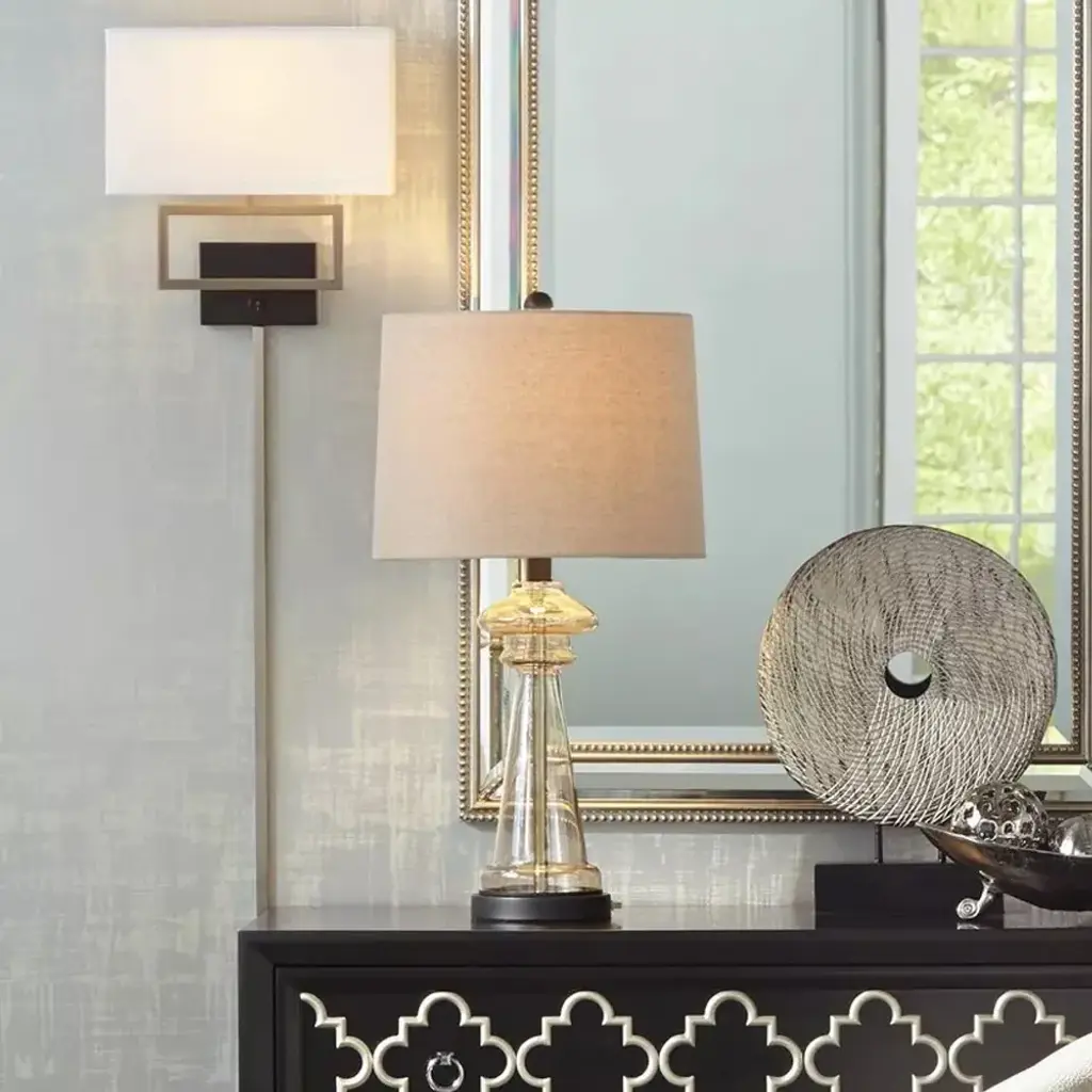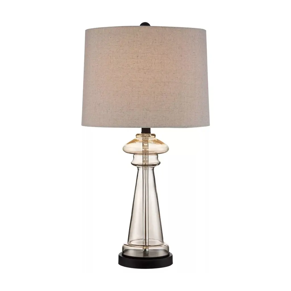PRODUCT DETAILS: 27" high overall. Shade is 13" across the top x 14" across the bottom x 10" high. Weighs 4.9 lbs. Uses one maximum 100 watt standard-medium base bulb (not included). On-off switch on socket. An elegant, luxurious look for a sitting area or traditional living room. Transparent glass with a champagne gold color tint. Black finish pedestal at the very bottom of the lamp. Taupe color fabric drum shade. 8-foot long cord.