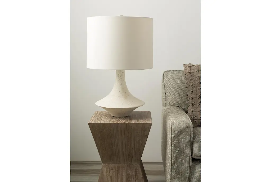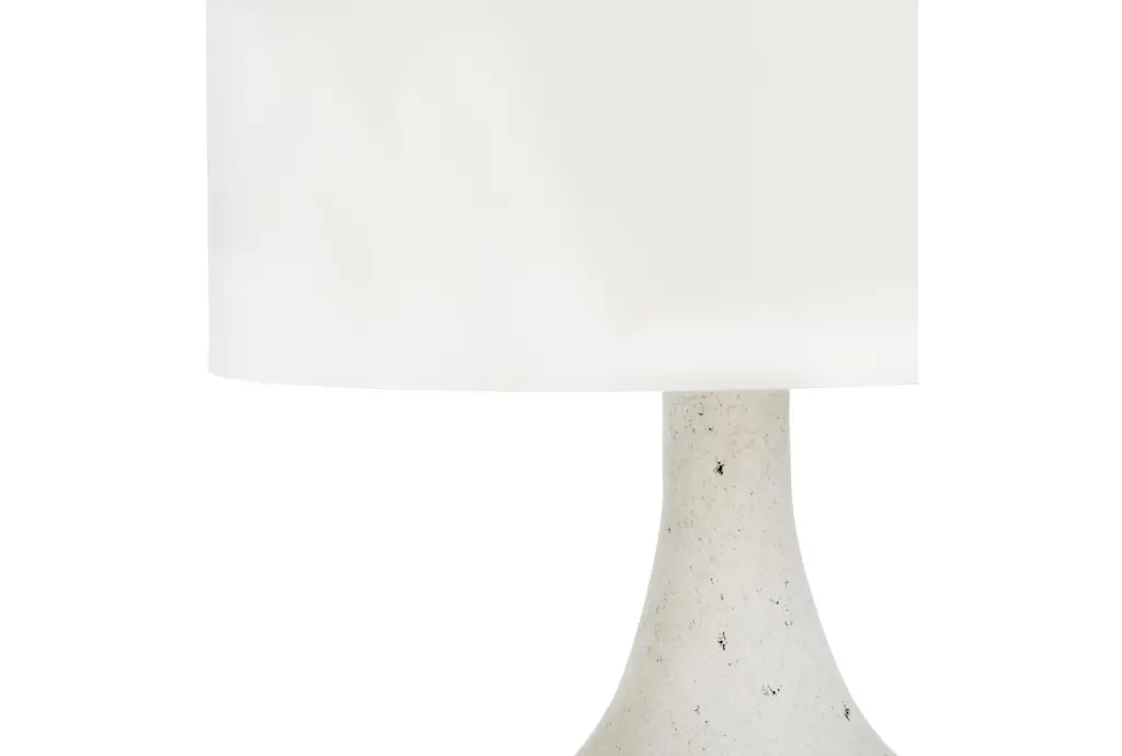Enhance your space with the Table Lamp-Grey White Composition | Oval By Surya. This modern fiber lamp features a white cotton drum shade that provides a soft glow, perfect for kids' rooms or bedrooms. The oval shape adds a unique touch to your decor.
