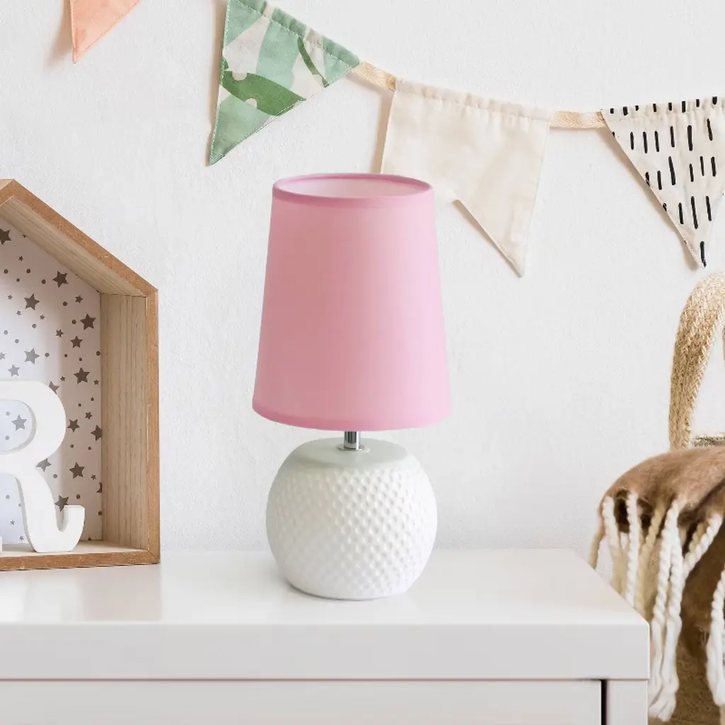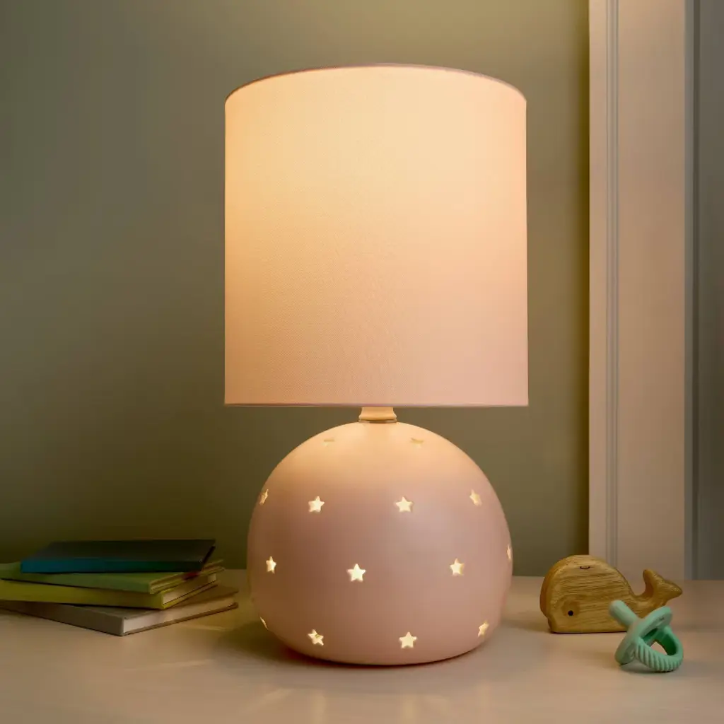 Add fun lighting accent to your child's room with this Table Lamp from cloud island™. This pink table lamp features a round ceramic base with starry cutouts on top that allow the light to pass through, and it comes with one LED bulb and a matching drum shade. The 3-way light setting produces three levels of light in low, medium and high. Simply place this lamp on any table or sideboard in their room for a warm glow.cloud island™: Designed with love. Made without compromise.