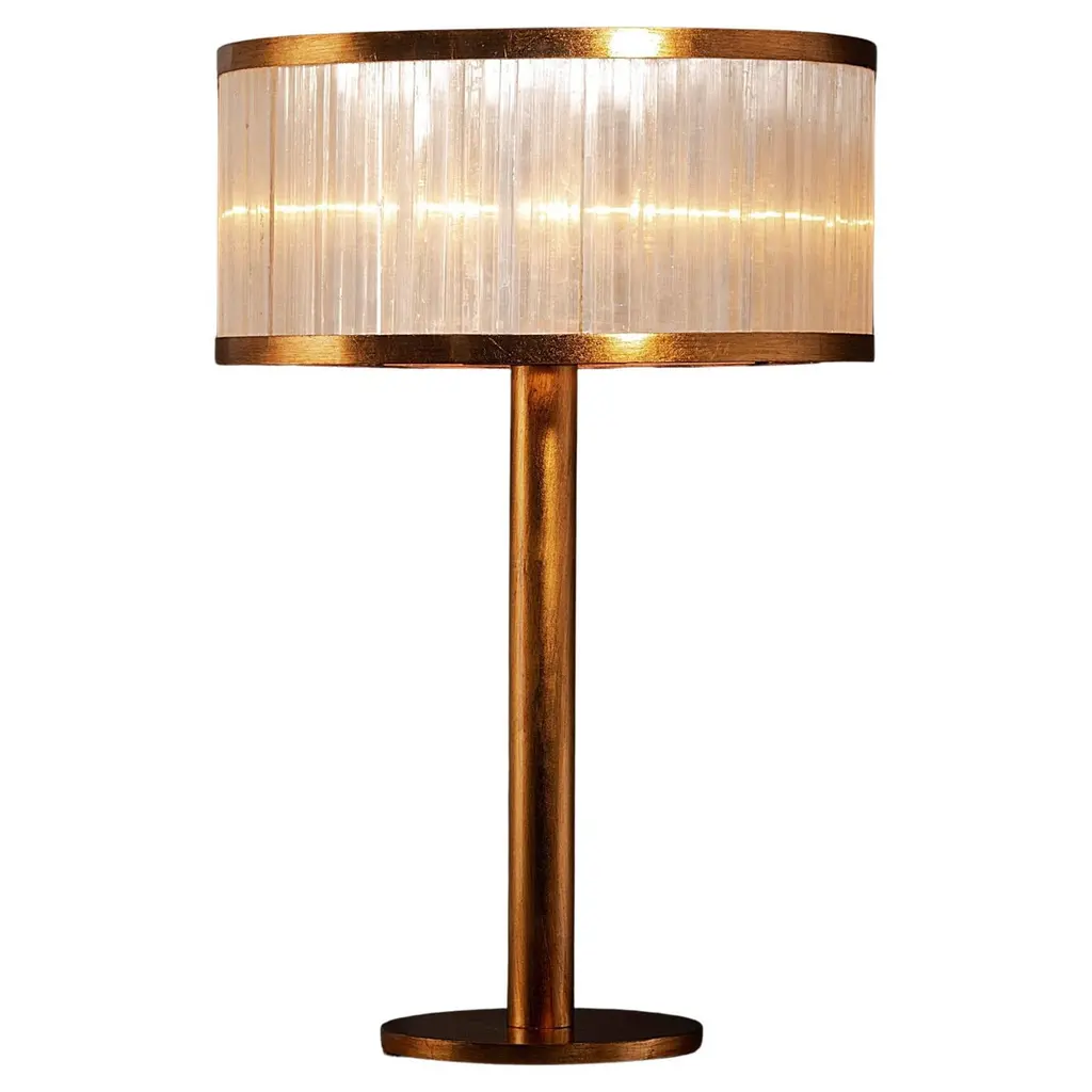 The understated color palette of opaque gold and white add to the subtle elegance to our Matilda Table Lamp. The simple oval lamp shade is hand painted "Willow" fabric in the soft white tree design. Perfect table lamp for the living room, bedroom, den and office. A decorative opaque Gold blown glass element is arranged on a round metal base. This lamp is equipped with a double bulb socket and is finished with beaded pulls and a beaded finial. Handcrafted in the USA! This fixture usually ships in 2-4 weeks. This item ships for free to the lower 48 states. • • Please note that the price listed pertains to a fixture that will appear very similar to the light shown in the featured photograph and as outlined in the accompanying description. Made with UL Listed parts. For use with two standard incandescent lightbulbs of up to 60-watt max (included). Can be used with an LED lightbulb of up to 100-watt max.