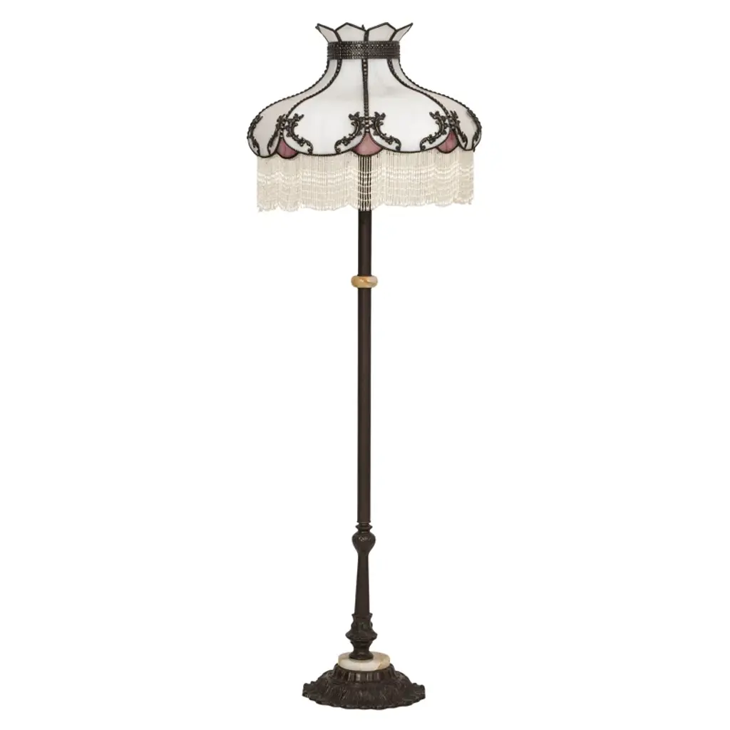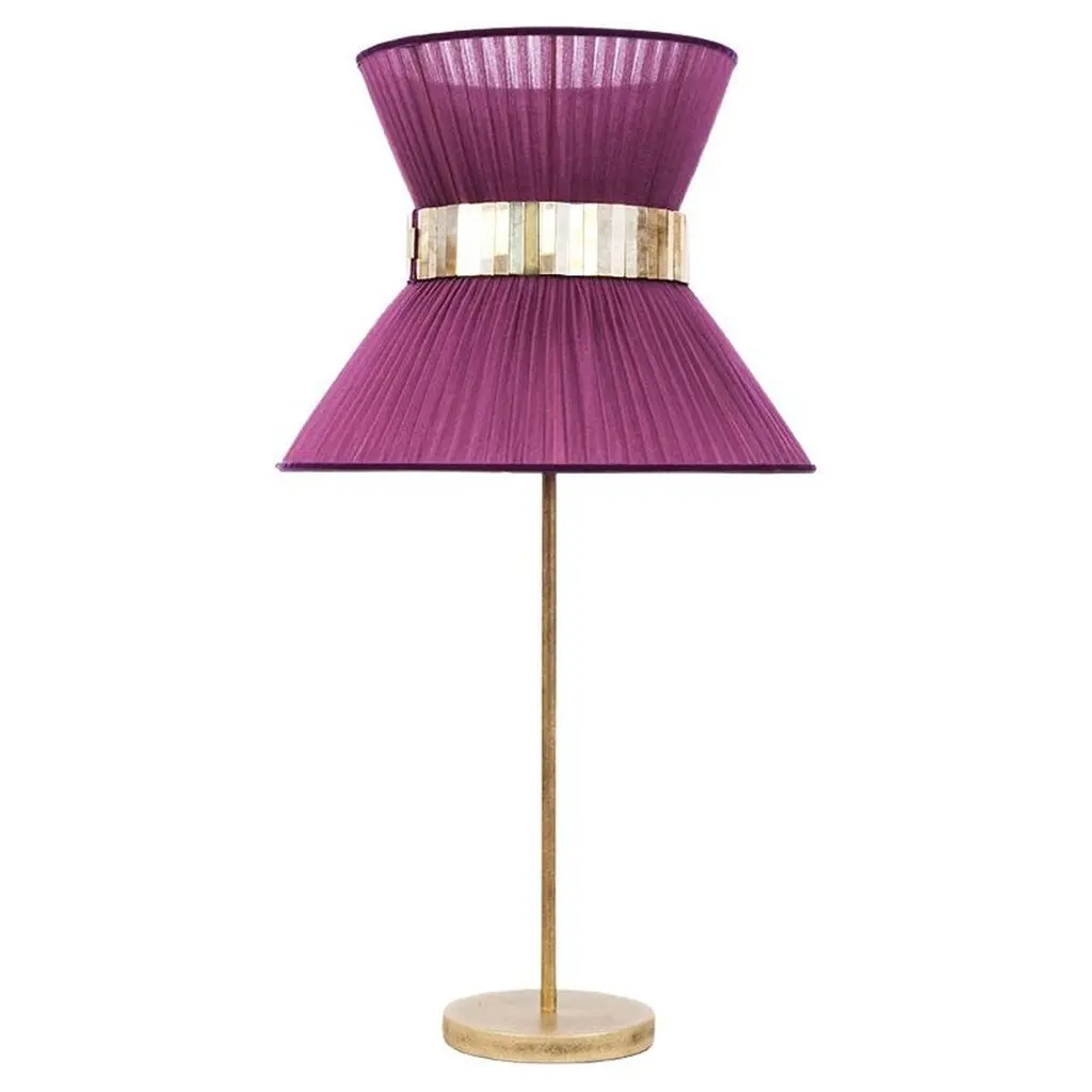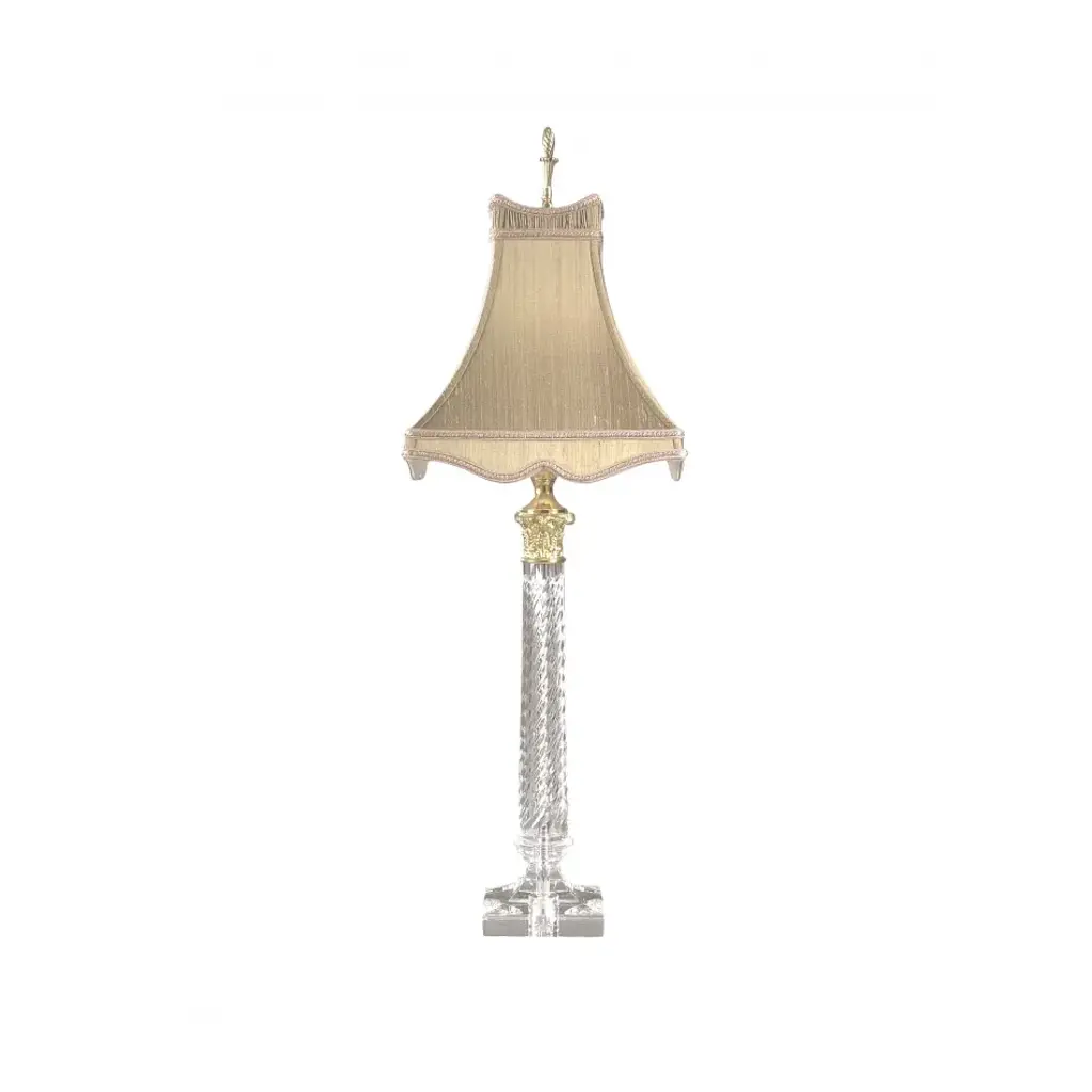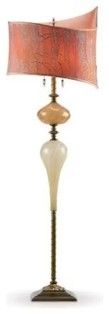 The Melissa Table Lamp features an unusual corset-shaped lamp shade in understated colors of gold and pale green. Perfect table lamp for the living room, bedroom, den and office. An elegant blown glass element in gold color is set on the base. A copper wire is coiled around the brass neck of the lamp. This lamp is equipped with a single bulb socket (bulbs not included) and is finished with a beaded pull and a beaded finial. Handcrafted in the USA! This fixture usually ships in 2-4 weeks. This item ships for free to the lower 48 states. • • Please note that the price listed pertains to a fixture that will appear very similar to the light shown in the featured photograph and as outlined in the accompanying description. Made with UL Listed parts. For use with a single standard incandescent lightbulb of up to 60-watt max (included). Can be used with an LED lightbulb of up to 100-watt max.