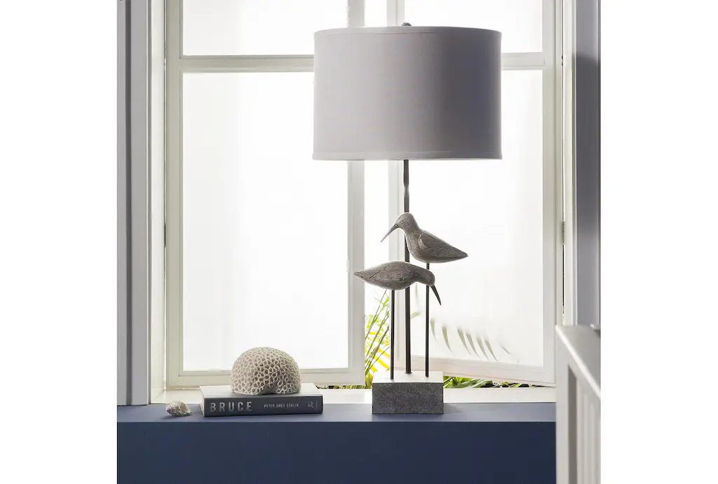Introducing the Table Lamp Rectangle Tall Metal with Hand Painted Bird Duo By Surya, a charming addition to any kids' bedroom. This rustic lamp features a white fiber base with a linen composition and metal accents. The unique design showcases hand-painted birds, adding a touch of whimsy to the room.